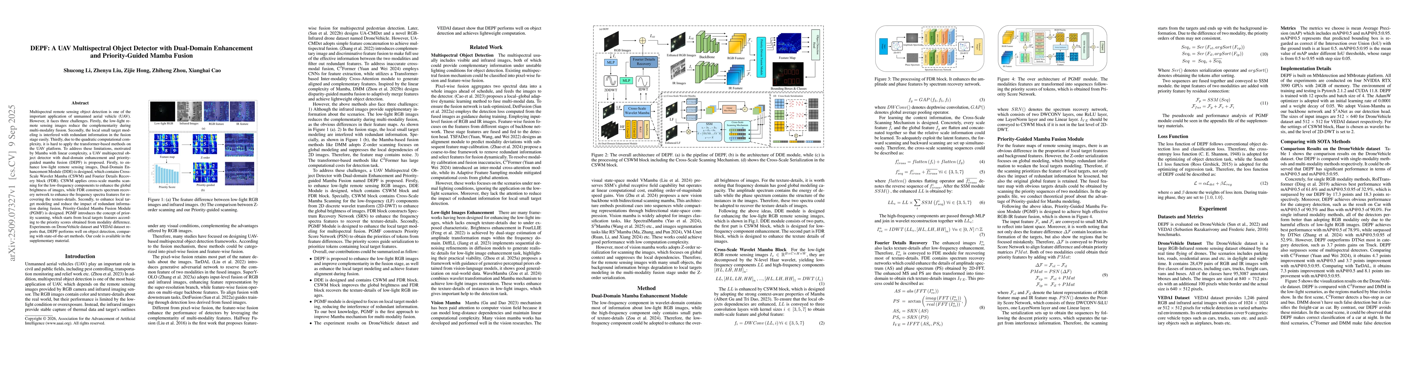 Multispectral remote sensing object detection is one of the important application of unmanned aerial vehicle (UAV). However, it faces three challenges. Firstly, the low-light remote sensing images reduce the complementarity during multi-modality fusion. Secondly, the local small target modeling is interfered with redundant information in the fusion stage easily. Thirdly, due to the quadratic computational complexity, it is hard to apply the transformer-based methods on the UAV platform. To address these limitations, motivated by Mamba with linear complexity, a UAV multispectral object detector with dual-domain enhancement and priority-guided mamba fusion (DEPF) is proposed. Firstly, to enhance low-light remote sensing images, Dual-Domain Enhancement Module (DDE) is designed, which contains Cross-Scale Wavelet Mamba (CSWM) and Fourier Details Recovery block (FDR). CSWM applies cross-scale mamba scanning for the low-frequency components to enhance the global brightness of images, while FDR constructs spectrum recovery network to enhance the frequency spectra features for recovering the texture-details. Secondly, to enhance local target modeling and reduce the impact of redundant information during fusion, Priority-Guided Mamba Fusion Module (PGMF) is designed. PGMF introduces the concept of priority scanning, which starts from local targets features according to the priority scores obtained from modality difference. Experiments on DroneVehicle dataset and VEDAI dataset reports that, DEPF performs well on object detection, comparing with state-of-the-art methods. Our code is available in the supplementary material.