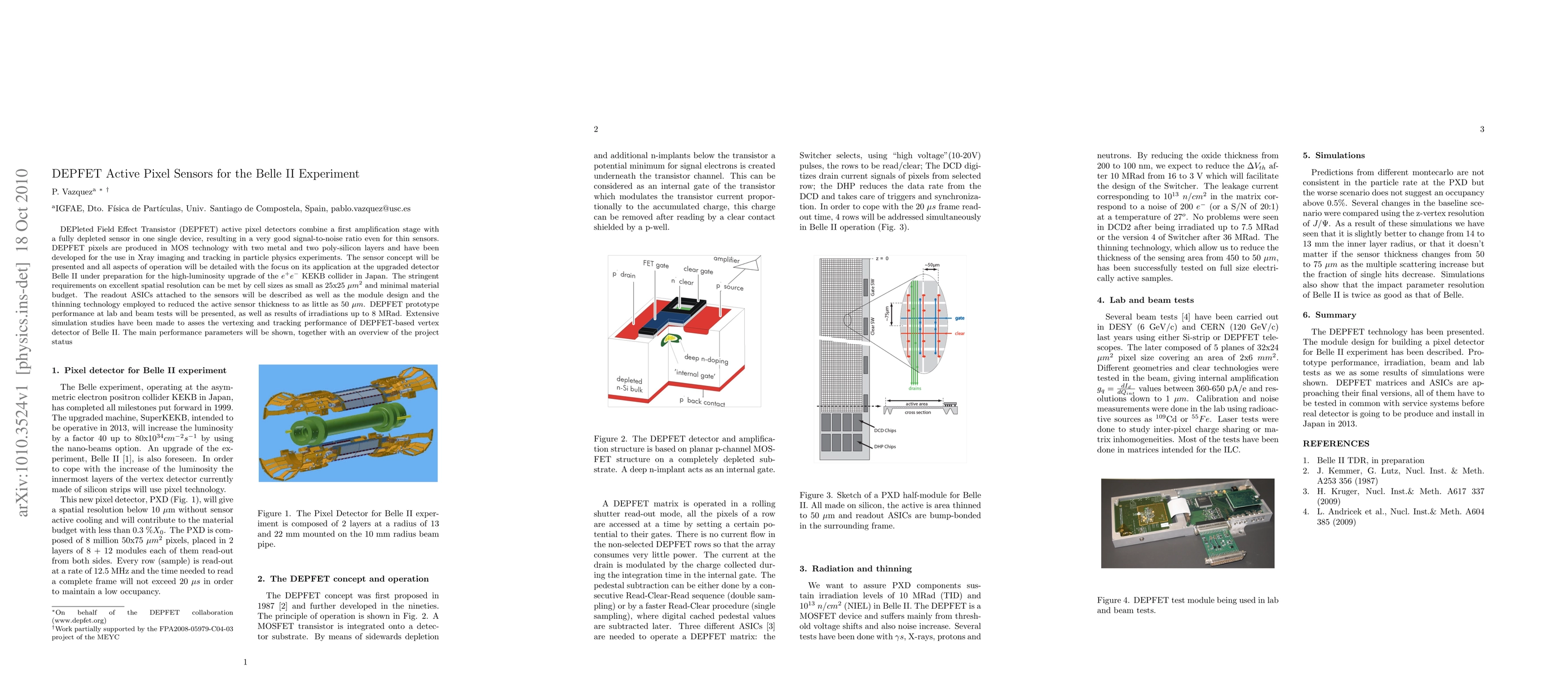 This paper presents DEPFET active pixel sensors designed for the Belle II experiment, emphasizing their excellent signal-to-noise ratio and small cell size. The sensors, produced in MOS technology, are optimized for X-ray imaging and particle tracking, with prototype performance and irradiation results discussed alongside extensive simulation studies.