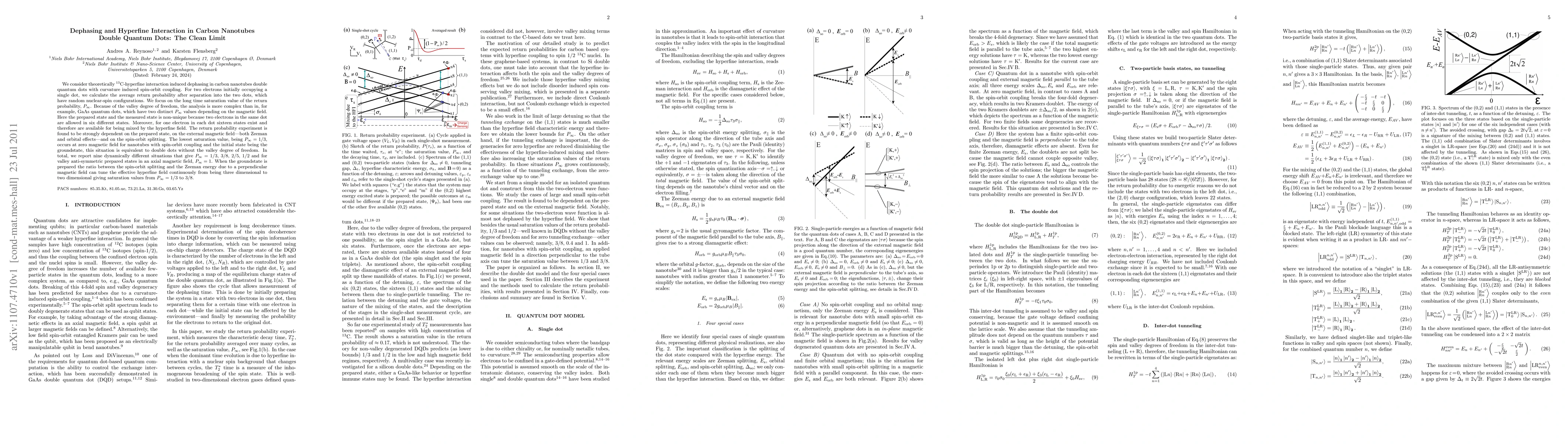 We consider theoretically ${}^{13}$C-hyperfine interaction induced dephasing in carbon nanotubes double quantum dots with curvature induced spin-orbit coupling. For two electrons initially occupying a single dot, we calculate the average return probability after separation into the two dots, which have random nuclear-spin configurations. We focus on the long time saturation value of the return probability, $P_\infty$. Because of the valley degree of freedom, the analysis is more complex than in, for example, GaAs quantum dots, which have two distinct $P_\infty$ values depending on the magnetic field. Here the prepared state and the measured state is non-unique because two electrons in the same dot are allowed in six different states. Moreover, for one electron in each dot sixteen states exist and therefore are available for being mixed by the hyperfine field. The return probability experiment is found to be strongly dependent on the prepared state, on the external magnetic field---both Zeeman and orbital effects - and on the spin-orbit splitting. The lowest saturation value, being $P_\infty$=1/3, occurs at zero magnetic field for nanotubes with spin-orbit coupling and the initial state being the groundstate, this situation is equivalent to double dots without the valley degree of freedom. In total, we report nine dynamically different situations that give $P_\infty$=1/3, 3/8, 2/5, 1/2 and for valley anti-symmetric prepared states in an axial magnetic field, $P_\infty$=1. When the groundstate is prepared the ratio between the spin-orbit splitting and the Zeeman energy due to a perpendicular magnetic field can tune the effective hyperfine field continuously from being three dimensional to two dimensional giving saturation values from $P_\infty$=1/3 to 3/8.