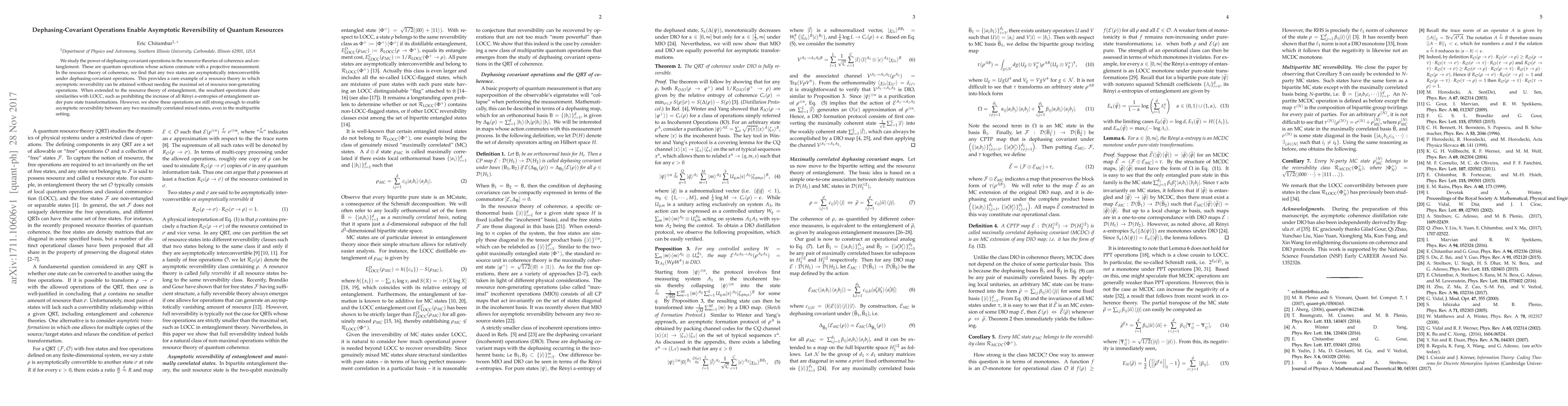 Asymptotic reversibility of quantum resources is achieved through dephasing-covariant operations, enabling the interconversion of any two states in coherence theory, and allowing for reversible transformations between maximally correlated mixed states in entanglement theory.