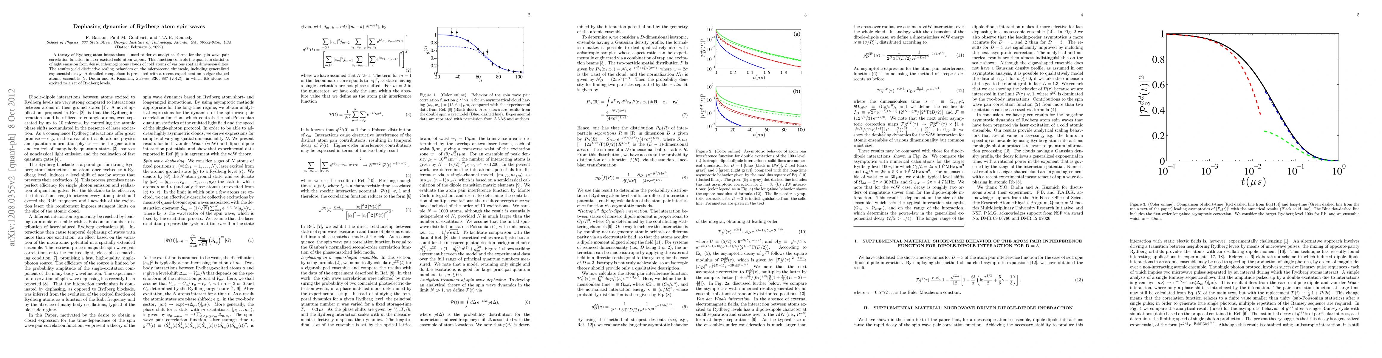 A theory of Rydberg atom interactions is used to derive analytical forms for the spin wave pair correlation function in laser-excited cold-atom vapors. This function controls the quantum statistics of light emission from dense, inhomogeneous clouds of cold atoms of various spatial dimensionalities. The results yield distinctive scaling behaviors on the microsecond timescale, including generalized exponential decay. A detailed comparison is presented with a recent experiment on a cigar-shaped atomic ensemble [Y. Dudin and A. Kuzmich, Science 336, 887 (2012)], in which Rb atoms are excited to a set of Rydberg levels.