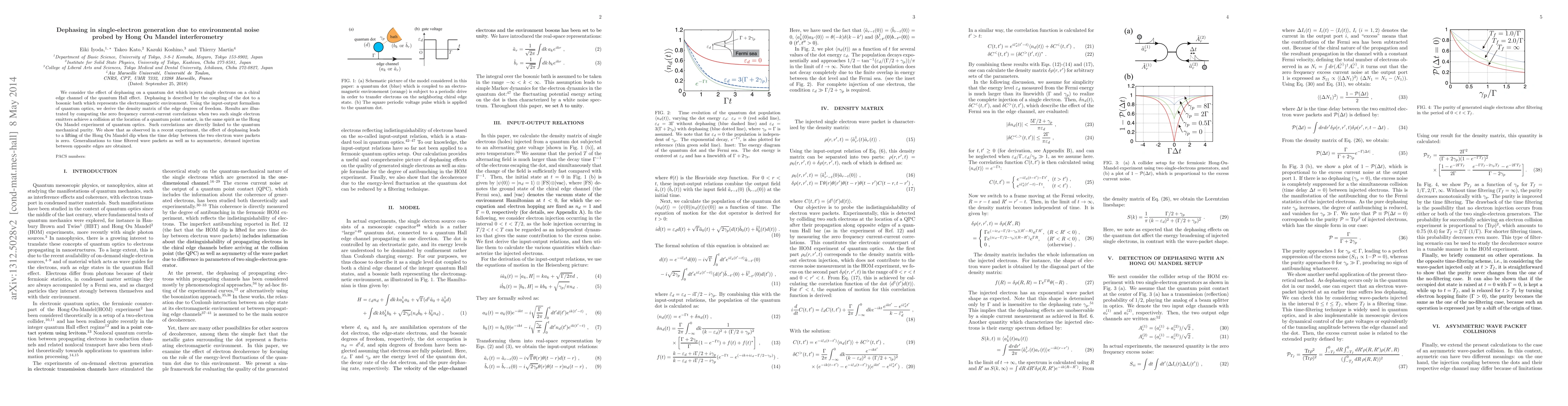 We consider the effect of dephasing on a quantum dot which injects single electrons on a chiral edge channel of the quantum Hall effect. Dephasing is described by the coupling of the dot to a bosonic bath which represents the electromagnetic environment. Using the input-output formalism of quantum optics, we derive the density matrix of the edge degrees of freedom. Results are illustrated by computing the zero frequency current-current correlations when two such single electron emitters achieve a collision at the location of a quantum point contact, in the same spirit as the Hong Ou Mandel experiment of quantum optics. Such correlations are directly linked to the quantum mechanical purity. We show that as observed in a recent experiment, the effect of dephasing leads to a non-vanishing of the Hong Ou Mandel dip when the time delay between the two electron wave packets is zero. Generalizations to time filtered wave packets as well as to asymmetric, detuned injection between opposite edges are obtained.