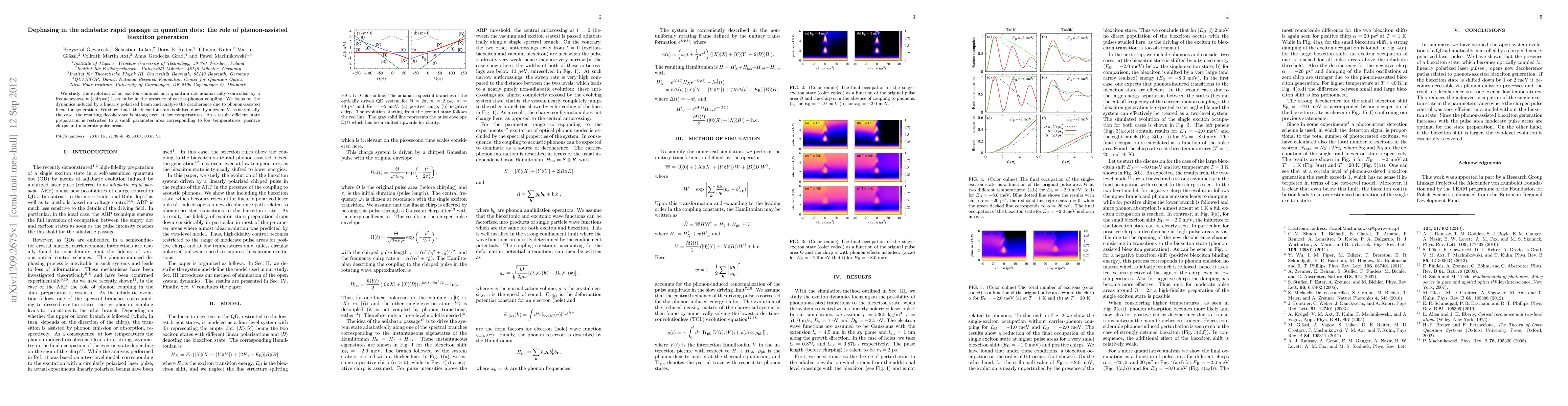 We study the evolution of an exciton confined in a quantum dot adiabatically controlled by a frequency-swept (chirped) laser pulse in the presence of carrier-phonon coupling. We focus on the dynamics induced by a linearly polarized beam and analyze the decoherence due to phonon-assisted biexciton generation. We show that if the biexciton state is shifted down by a few meV, as is typically the case, the resulting decoherence is strong even at low temperatures. As a result, efficient state preparation is restricted to a small parameter area corresponding to low temperatures, positive chirps and moderate pulse areas.
