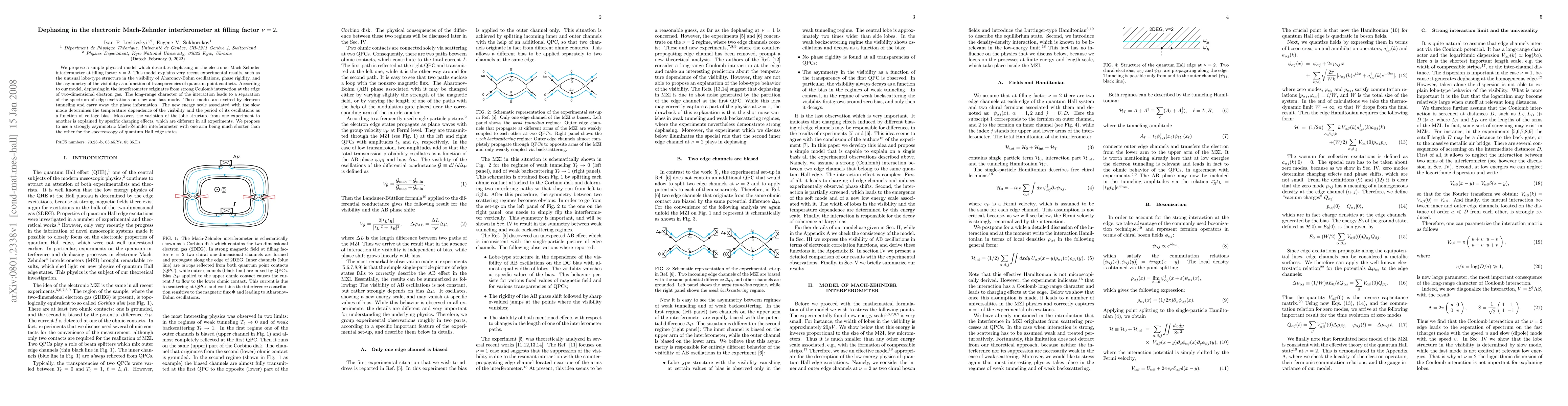 This paper proposes a model explaining dephasing in electronic Mach-Zehnder interferometers at filling factor 2, attributing it to strong Coulomb interactions at the edge of two-dimensional electron gas. The model accounts for experimental observations like the lobe-type visibility structure and asymmetry, suggesting the use of asymmetric interferometers for quantum Hall edge state spectroscopy.