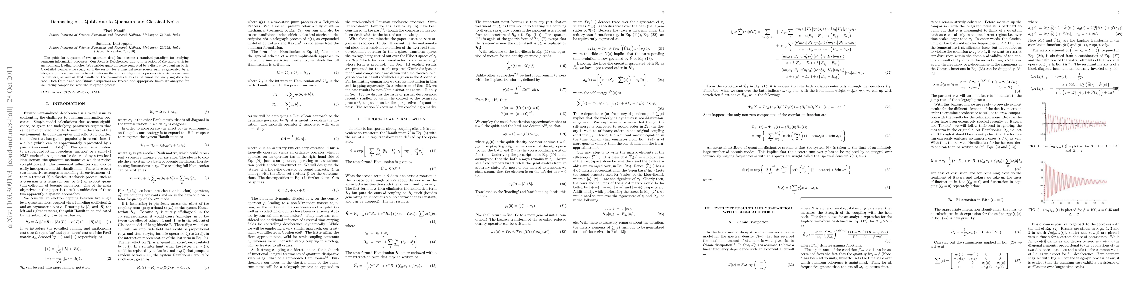 This paper investigates the decoherence of a qubit due to both quantum and classical noise sources, comparing quantum noise from a dissipative quantum bath with classical noise from a telegraph process. The study sets limits on the applicability of classical noise models and identifies parameters for analyzing decoherence.