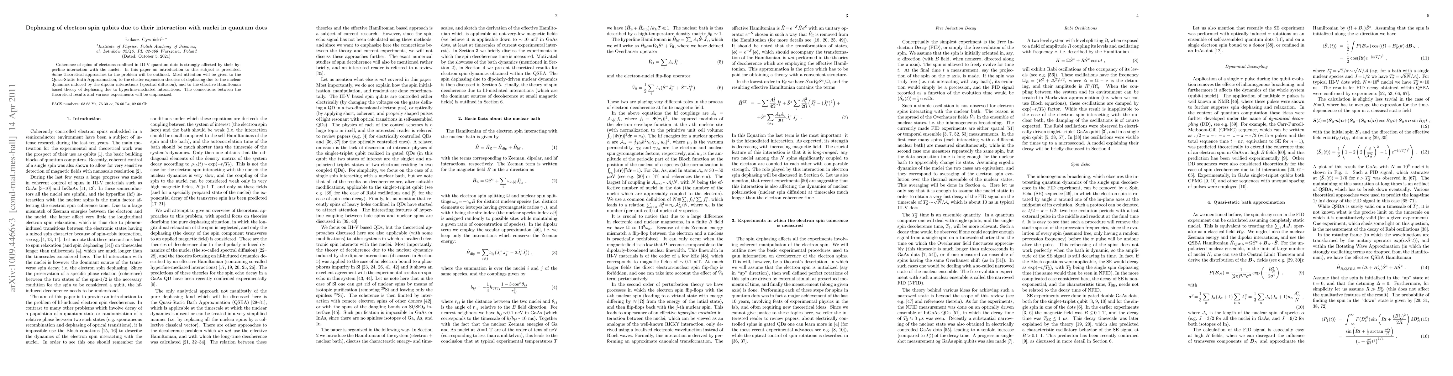 This paper explores the dephasing of electron spin qubits in quantum dots due to hyperfine interactions with nuclei, focusing on theoretical approaches like the Quasi-Static Bath Approximation and cluster expansion theories. It emphasizes connections between these theories and experimental observations.