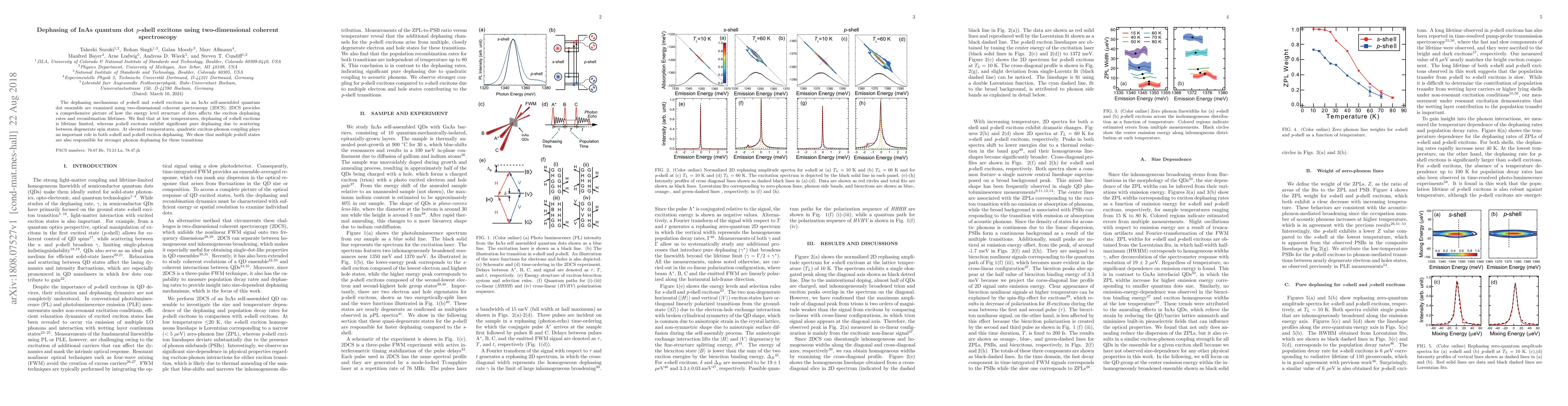 This paper investigates the dephasing mechanisms of excitons in InAs quantum dots using two-dimensional coherent spectroscopy, revealing that s-shell excitons dephase primarily due to lifetime limitations at low temperatures, while p-shell excitons experience significant pure dephasing from spin state scattering. At higher temperatures, exciton-phonon coupling becomes crucial for both s- and p-shell excitons.