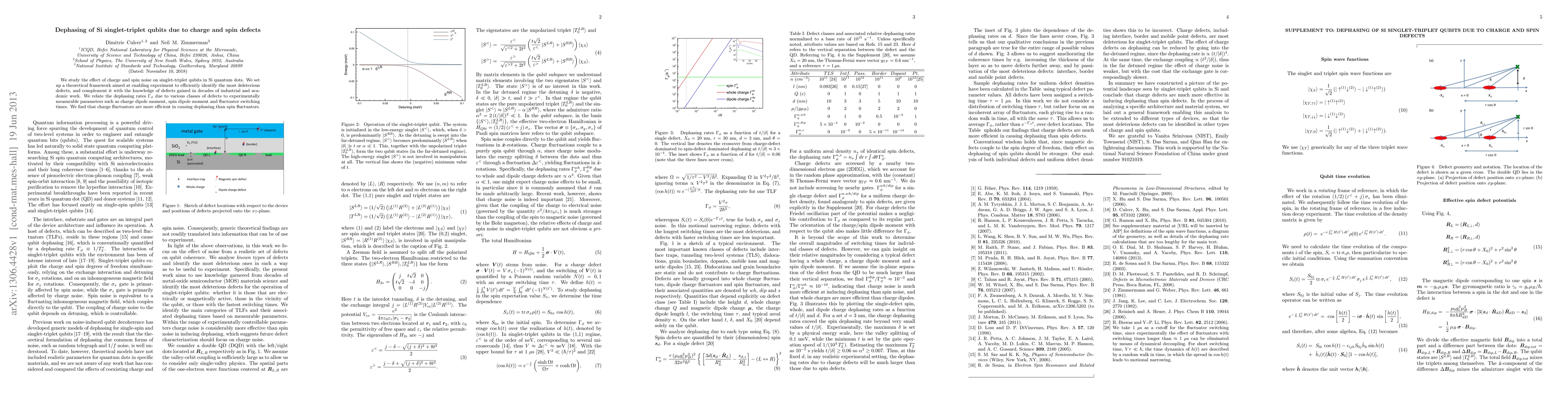 We study the effect of charge and spin noise on singlet-triplet qubits in Si quantum dots. We set up a theoretical framework aimed at enabling experiment to efficiently identify the most deleterious defects, and complement it with the knowledge of defects gained in decades of industrial and academic work. We relate the dephasing rates $\Gamma_\phi$ due to various classes of defects to experimentally measurable parameters such as charge dipole moment, spin dipole moment and fluctuator switching times. We find that charge fluctuators are more efficient in causing dephasing than spin fluctuators.