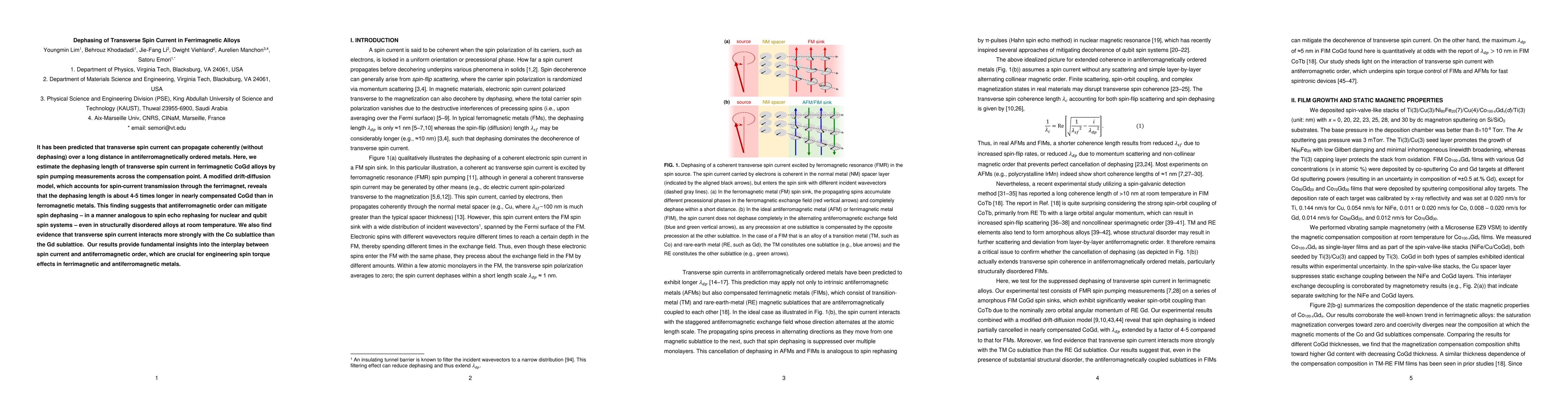 The paper presents a modified drift-diffusion model to estimate the dephasing length of transverse spin current in ferrimagnetic alloys, accounting for spin-current transmission through the ferrimagnet.