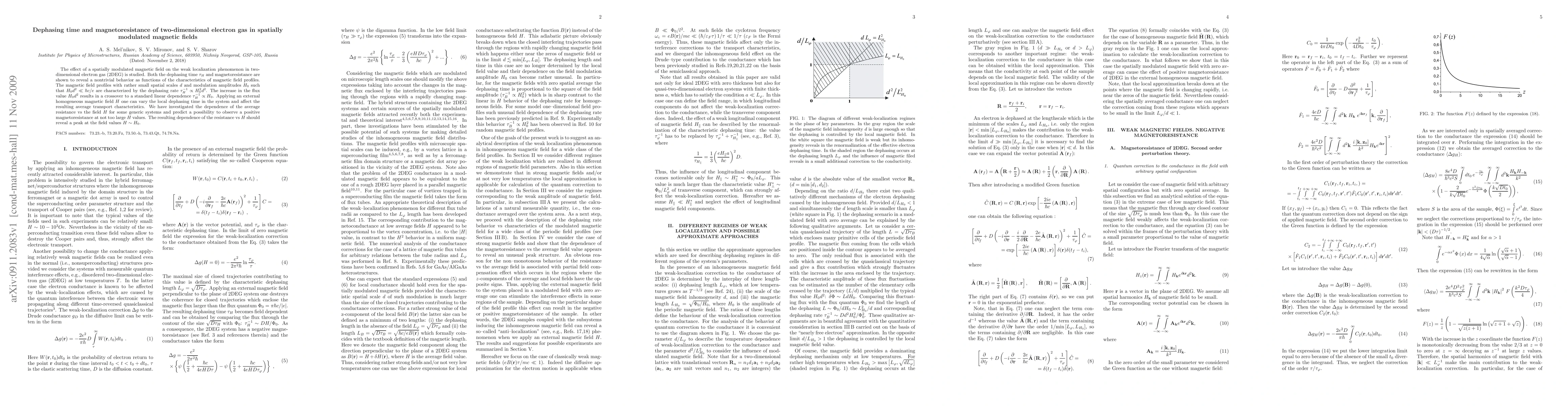 This paper investigates the weak localization phenomenon in two-dimensional electron gas under spatially modulated magnetic fields, showing that dephasing time and magnetoresistance exhibit complex behaviors dependent on field characteristics. The study reveals a crossover in dephasing rate with increasing modulation amplitude and spatial scale, predicting a peak in magnetoresistance at specific field values.