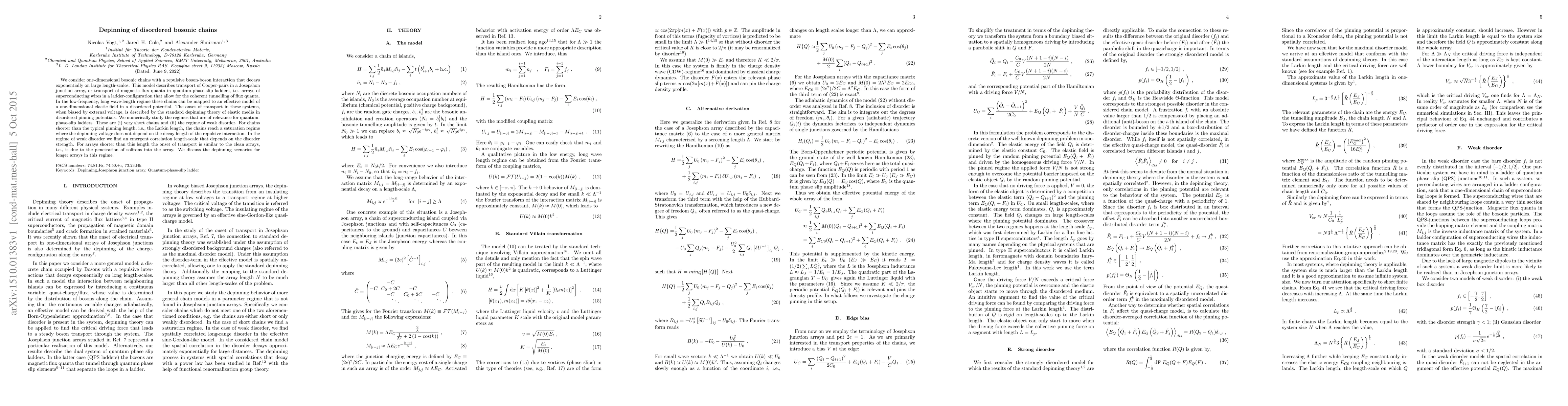 This research investigates one-dimensional bosonic chains with exponentially decaying repulsive interactions, relevant for Cooper-pair transport in Josephson junction arrays or magnetic flux transport in quantum-phase-slip ladders. The study focuses on the depinning behavior in short chains and weak disorder scenarios, revealing saturation in depinning voltage and an emergent correlation length dependent on disorder strength.