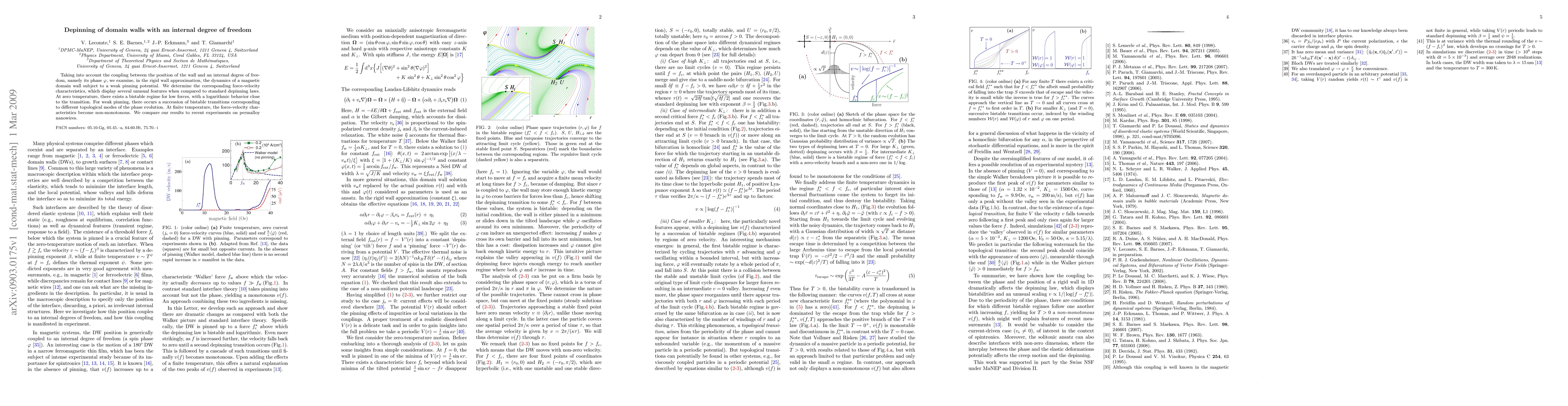 Taking into account the coupling between the position of the wall and an internal degree of freedom, namely its phase $\phi$, we examine, in the rigid wall approximation, the dynamics of a magnetic domain wall subject to a weak pinning potential. We determine the corresponding force-velocity characteristics, which display several unusual features when compared to standard depinning laws. At zero temperature, there exists a bistable regime for low forces, with a logarithmic behavior close to the transition. For weak pinning, there occurs a succession of bistable transitions corresponding to different topological modes of the phase evolution. At finite temperature, the force-velocity characteristics become non-monotonous. We compare our results to recent experiments on permalloy nanowires.