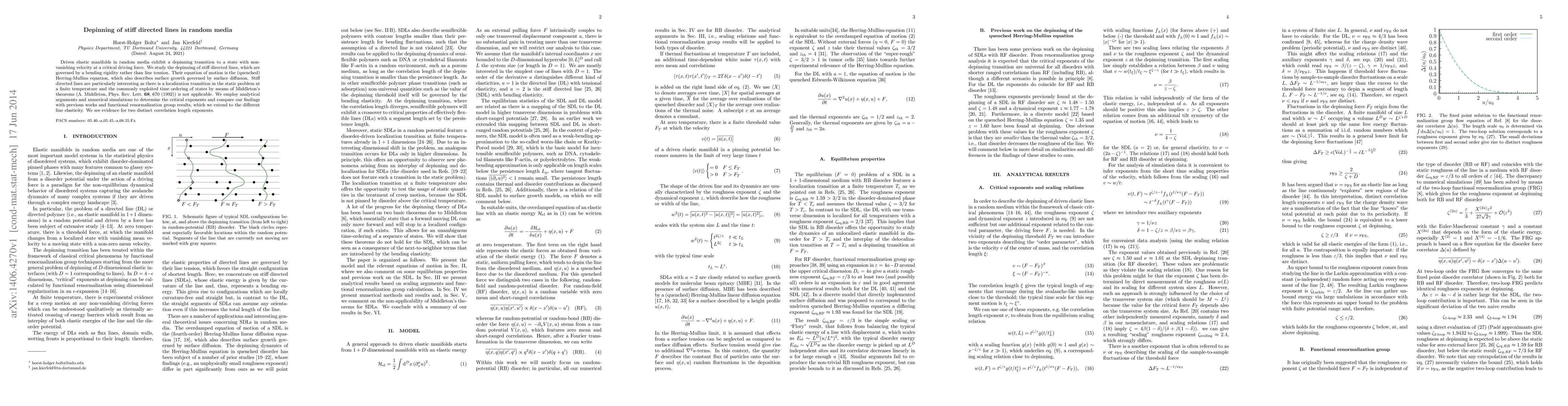 This paper investigates the depinning transition of stiff directed lines in random media, governed by the Herring-Mullins equation. The study reveals a localization transition and identifies two distinct correlation length exponents, contrasting with previous works and extending functional renormalization group results to different line elasticity.