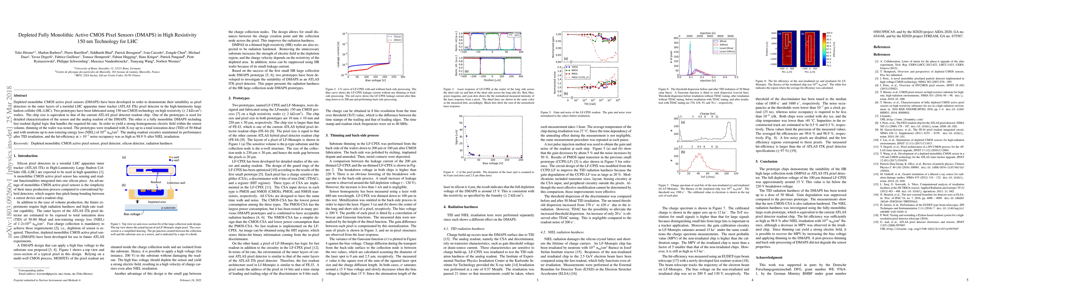 Depleted monolithic CMOS active pixel sensors (DMAPS) have been developed in order to demonstrate their suitability as pixel detectors in the outer layers of a toroidal LHC apparatus inner tracker (ATLAS ITk) pixel detector in the high-luminosity large hadron collider (HL-LHC). Two prototypes have been fabricated using 150 nm CMOS technology on high resistivity (> 2 k$\Omega$ $cm^2$) wafers. The chip size is equivalent to that of the current ATLAS pixel detector readout chip. One of the prototypes is used for detailed characterization of the sensor and the analog readout of the DMAPS. The other is a fully monolithic DMAPS including fast readout digital logic that handles the required hit rate. In order to yield a strong homogeneous electric field within the sensor volume, thinning of the wafer was tested. The prototypes were irradiated with X-ray up to a total ionization dose (TID) of 50 Mrad and with neutrons up to non-ionizing energy loss (NIEL) of $10^{15}$ $n_{eq}/cm^2$. The analog readout circuitry maintained its performance after TID irradiation, and the hit-efficiency at > $10^7$ noise occupancy was as high as 98.9 % after NIEL irradiation.