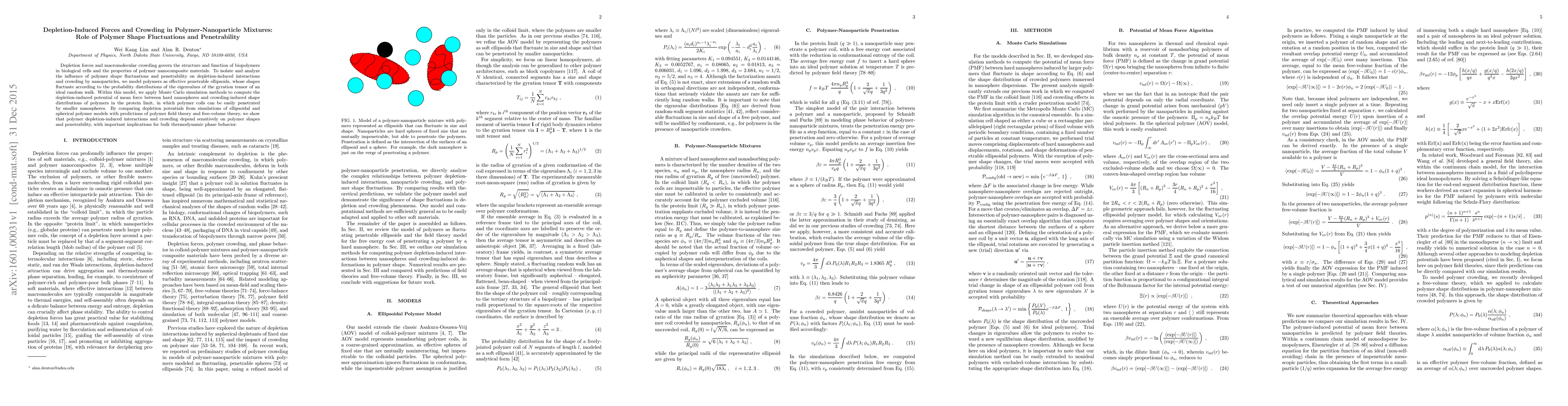 This research investigates how polymer shape fluctuations and penetrability influence depletion-induced forces and crowding in polymer-nanoparticle mixtures, using Monte Carlo simulations on ellipsoidal polymers and comparing results with polymer field and free-volume theories to highlight the sensitivity of these interactions to polymer geometry.