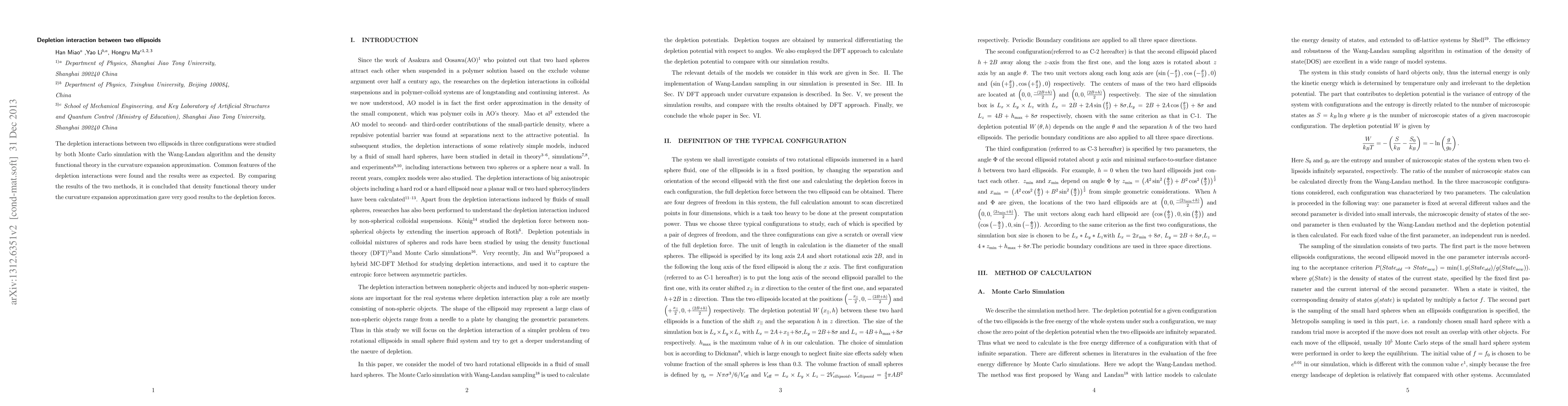 The depletion interactions between two ellipsoids in three configurations were studied by both Monte Carlo simulation with the Wang-Landau algorithm and the density functional theory in the curvature expansion approximation. Common features of the depletion interactions were found and the results were as expected. By comparing the results of the two methods, it is concluded that density functional theory under the curvature expansion approximation gave very good results to the depletion forces.