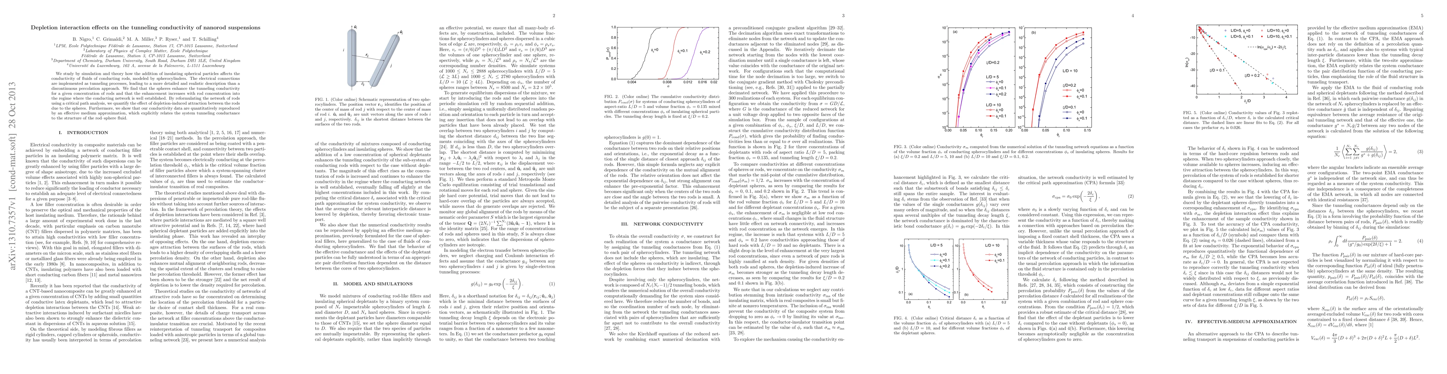 This paper investigates how insulating spherical particles influence the tunneling conductivity of fluids containing conducting nanorods, finding that the spheres enhance conductivity, especially as rod concentration increases. The study uses a critical path analysis to quantify the depletion-induced attraction between rods due to the spheres, and validates the results with an effective medium approximation.