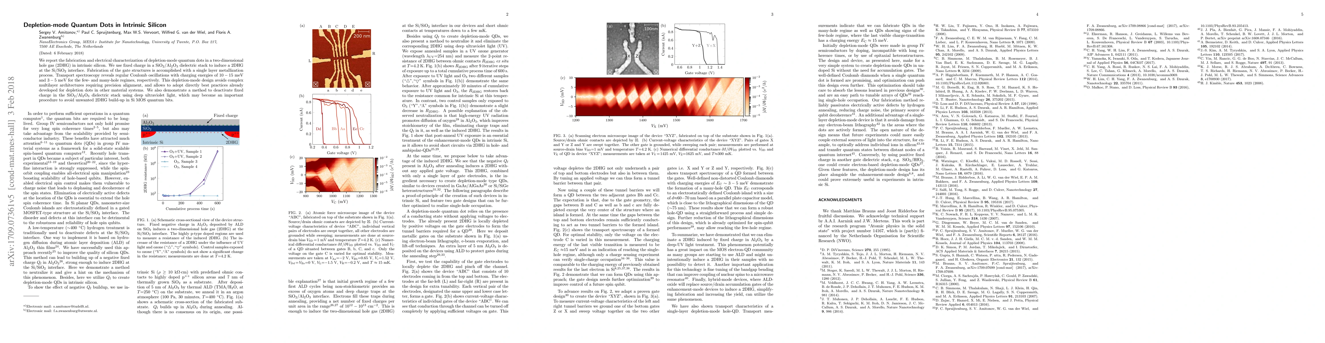 This paper details the fabrication and electrical characterization of depletion-mode quantum dots in intrinsic silicon, revealing regular Coulomb oscillations and demonstrating a method to deactivate fixed charge using deep ultraviolet light. The design avoids complex multilayer architectures and aligns with best practices from other material systems.