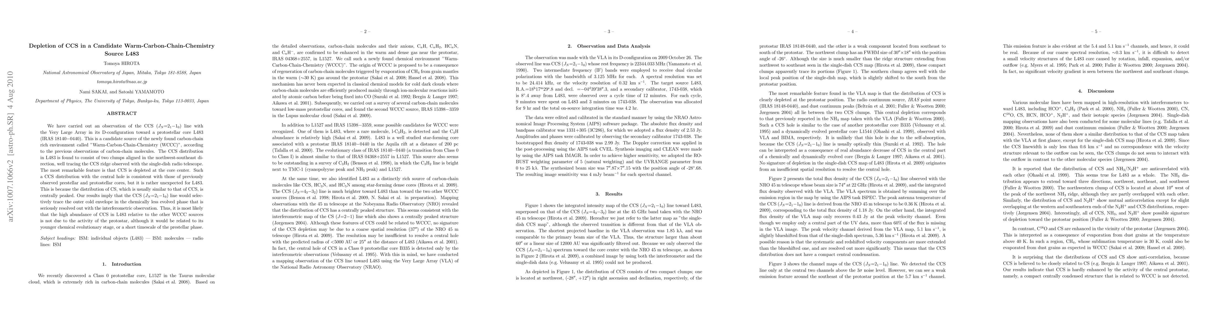 We have carried out an observation of the CCS ($J_{N}$=2$_{1}-$1$_{0}$) line with the Very Large Array in its D-configuration toward a protostellar core L483 (IRAS~18140$-$0440). This is a candidate source of the newly found carbon-chain rich environment called "Warm-Carbon-Chain-Chemistry (WCCC)", according to the previous observations of carbon-chain molecules. The CCS distribution in L483 is found to consist of two clumps aligned in the northwest-southeast direction, well tracing the CCS ridge observed with the single-dish radio telescope. The most remarkable feature is that CCS is depleted at the core center. Such a CCS distribution with the central hole is consistent with those of previously observed prestellar and protostellar cores, but it is rather unexpected for L483. This is because the distribution of CS, which is usually similar to that of CCS, is centrally peaked. Our results imply that the CCS ($J_{N}$=2$_{1}-$1$_{0}$) line would selectively trace the outer cold envelope in the chemically less evolved phase that is seriously resolved out with the interferometric observation. Thus, it is most likely that the high abundance of CCS in L483 relative to the other WCCC sources is not due to the activity of the protostar, although it would be related to its younger chemical evolutionary stage, or a short timescale of the prestellar phase.