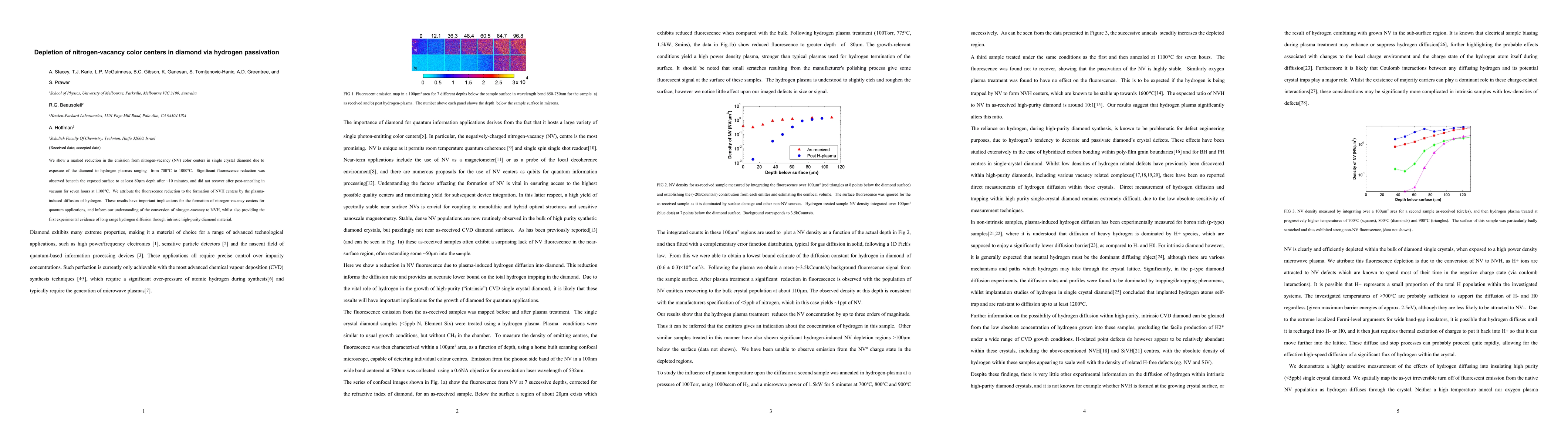 This paper demonstrates that exposure of single crystal diamond to hydrogen plasmas significantly reduces the emission from nitrogen-vacancy color centers, attributing the effect to the formation of NVH centers via hydrogen diffusion. This has implications for quantum applications and provides evidence of long-range hydrogen diffusion in high-purity diamond.