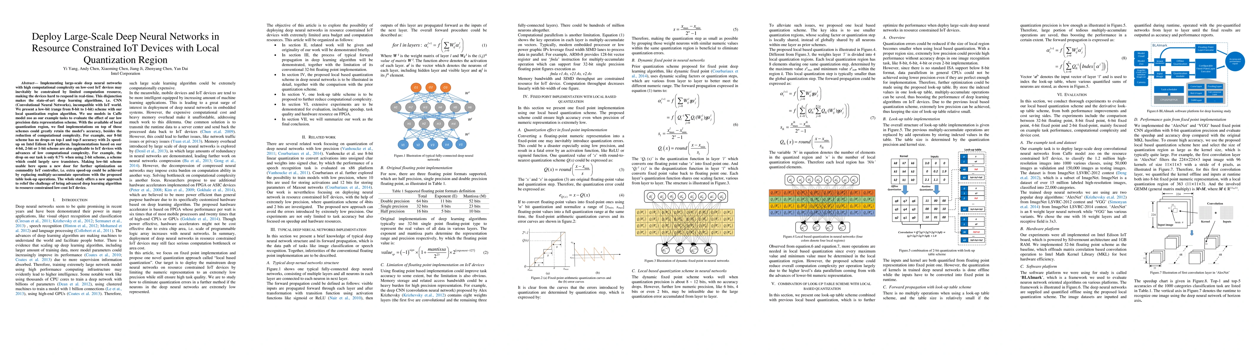 This paper proposes a low-bit quantization scheme with local quantization regions to deploy large-scale deep neural networks on resource-constrained IoT devices, achieving significant speedups with minimal loss in accuracy. The study demonstrates that 8-bit quantization maintains accuracy while doubling the speed on Intel Edison, and 2-bit quantization incurs only a 0.7% loss, enabling efficient deployment of deep learning on low-cost IoT platforms.