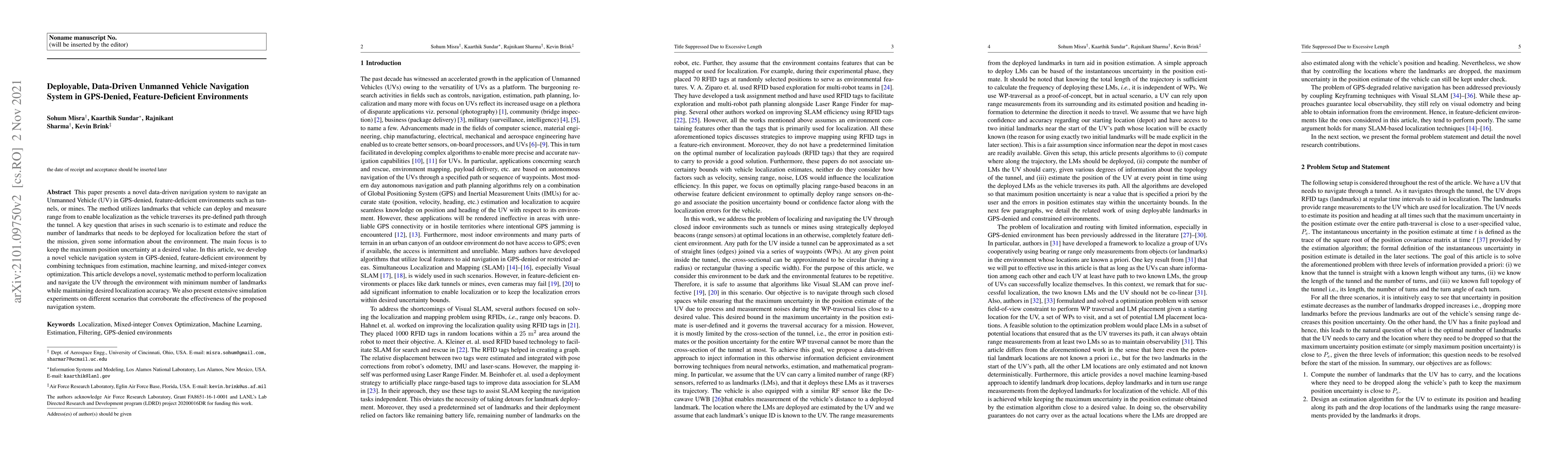 This paper presents a novel data-driven navigation system to navigate an Unmanned Vehicle (UV) in GPS-denied, feature-deficient environments such as tunnels, or mines. The method utilizes landmarks that vehicle can deploy and measure range from to enable localization as the vehicle traverses its pre-defined path through the tunnel. A key question that arises in such scenario is to estimate and reduce the number of landmarks that needs to be deployed for localization before the start of the mission, given some information about the environment. The main focus is to keep the maximum position uncertainty at a desired value. In this article, we develop a novel vehicle navigation system in GPS-denied, feature-deficient environment by combining techniques from estimation, machine learning, and mixed-integer convex optimization. This article develops a novel, systematic method to perform localization and navigate the UV through the environment with minimum number of landmarks while maintaining desired localization accuracy. We also present extensive simulation experiments on different scenarios that corroborate the effectiveness of the proposed navigation system.