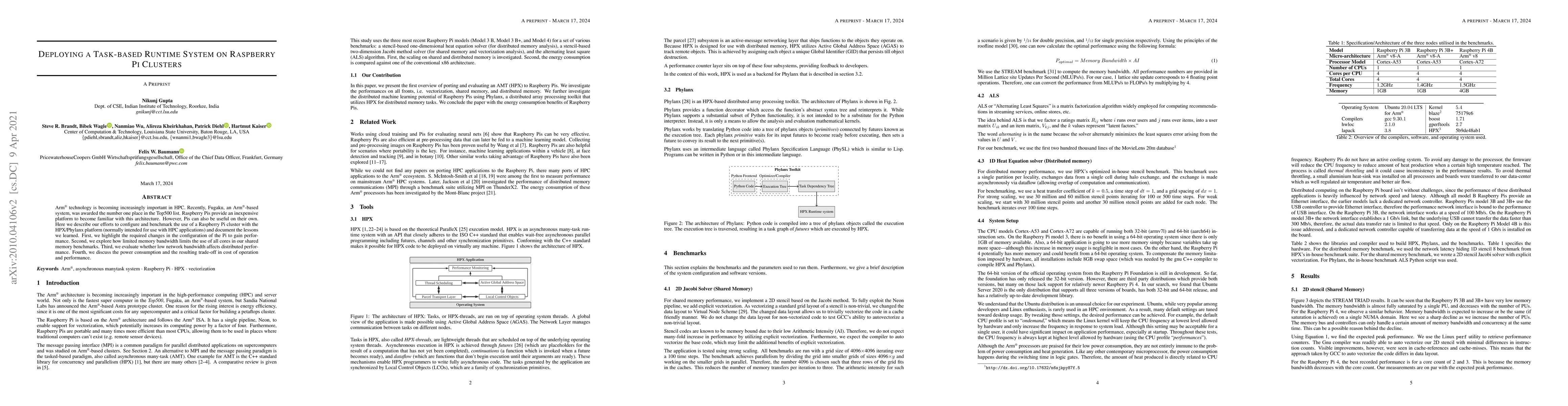 Arm technology is becoming increasingly important in HPC. Recently, Fugaku, an \arm-based system, was awarded the number one place in the Top500 list. Raspberry Pis provide an inexpensive platform to become familiar with this architecture. However, Pis can also be useful on their own. Here we describe our efforts to configure and benchmark the use of a Raspberry Pi cluster with the HPX/Phylanx platform (normally intended for use with HPC applications) and document the lessons we learned. First, we highlight the required changes in the configuration of the Pi to gain performance. Second, we explore how limited memory bandwidth limits the use of all cores in our shared memory benchmarks. Third, we evaluate whether low network bandwidth affects distributed performance. Fourth, we discuss the power consumption and the resulting trade-off in cost of operation and performance.