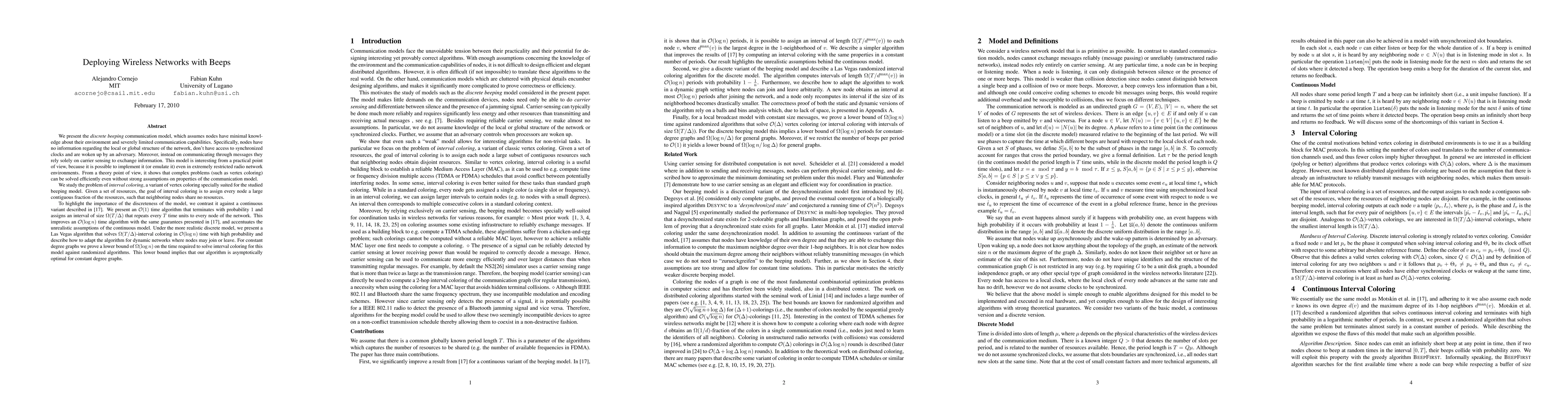 We present the \emph{discrete beeping} communication model, which assumes nodes have minimal knowledge about their environment and severely limited communication capabilities. Specifically, nodes have no information regarding the local or global structure of the network, don't have access to synchronized clocks and are woken up by an adversary. Moreover, instead on communicating through messages they rely solely on carrier sensing to exchange information. We study the problem of \emph{interval coloring}, a variant of vertex coloring specially suited for the studied beeping model. Given a set of resources, the goal of interval coloring is to assign every node a large contiguous fraction of the resources, such that neighboring nodes share no resources. To highlight the importance of the discreteness of the model, we contrast it against a continuous variant described in [17]. We present an O(1$ time algorithm that terminates with probability 1 and assigns an interval of size $\Omega(T/\Delta)$ that repeats every $T$ time units to every node of the network. This improves an $O(\log n)$ time algorithm with the same guarantees presented in \cite{infocom09}, and accentuates the unrealistic assumptions of the continuous model. Under the more realistic discrete model, we present a Las Vegas algorithm that solves $\Omega(T/\Delta)$-interval coloring in $O(\log n)$ time with high probability and describe how to adapt the algorithm for dynamic networks where nodes may join or leave. For constant degree graphs we prove a lower bound of $\Omega(\log n)$ on the time required to solve interval coloring for this model against randomized algorithms. This lower bound implies that our algorithm is asymptotically optimal for constant degree graphs.