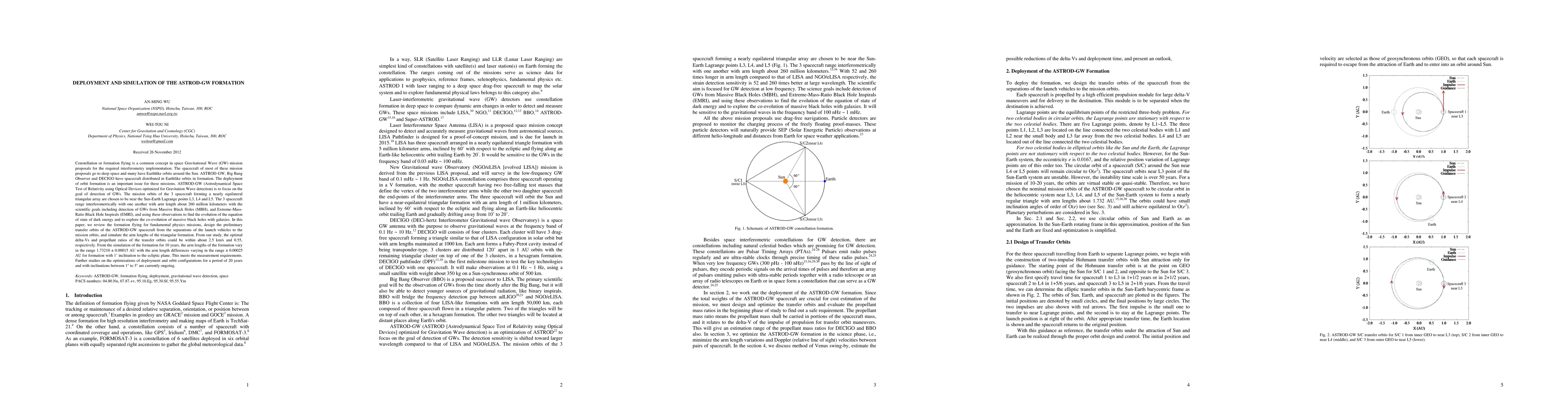 Constellation or formation flying is a common concept in space Gravitational Wave (GW) mission proposals for the required interferometry implementation. The spacecraft of most of these mission proposals go to deep space and many have Earthlike orbits around the Sun. ASTROD-GW, Big Bang Observer and DECIGO have spacecraft distributed in Earthlike orbits in formation. The deployment of orbit formation is an important issue for these missions. ASTROD-GW (Astrodynamical Space Test of Relativity using Optical Devices optimized for Gravitation Wave detection) is to focus on the goal of detection of GWs. The mission orbits of the 3 spacecraft forming a nearly equilateral triangular array are chosen to be near the Sun-Earth Lagrange points L3, L4 and L5. The 3 spacecraft range interferometrically with one another with arm length about 260 million kilometers with the scientific goals including detection of GWs from Massive Black Holes (MBH), and Extreme-Mass-Ratio Black Hole Inspirals (EMRI), and using these observations to find the evolution of the equation of state of dark energy and to explore the co-evolution of massive black holes with galaxies. In this paper, we review the formation flying for fundamental physics missions, design the preliminary transfer orbits of the ASTROD-GW spacecraft from the separations of the launch vehicles to the mission orbits, and simulate the arm lengths of the triangular formation. From our study, the optimal delta-Vs and propellant ratios of the transfer orbits could be within about 2.5 km/s and 0.55, respectively. From the simulation of the formation for 10 years, the arm lengths of the formation vary in the range 1.73210 +- 0.00015 AU with the arm length differences varying in the range +- 0.00025 AU for formation with 1 degree inclination to the ecliptic plane. This meets the measurement requirements.