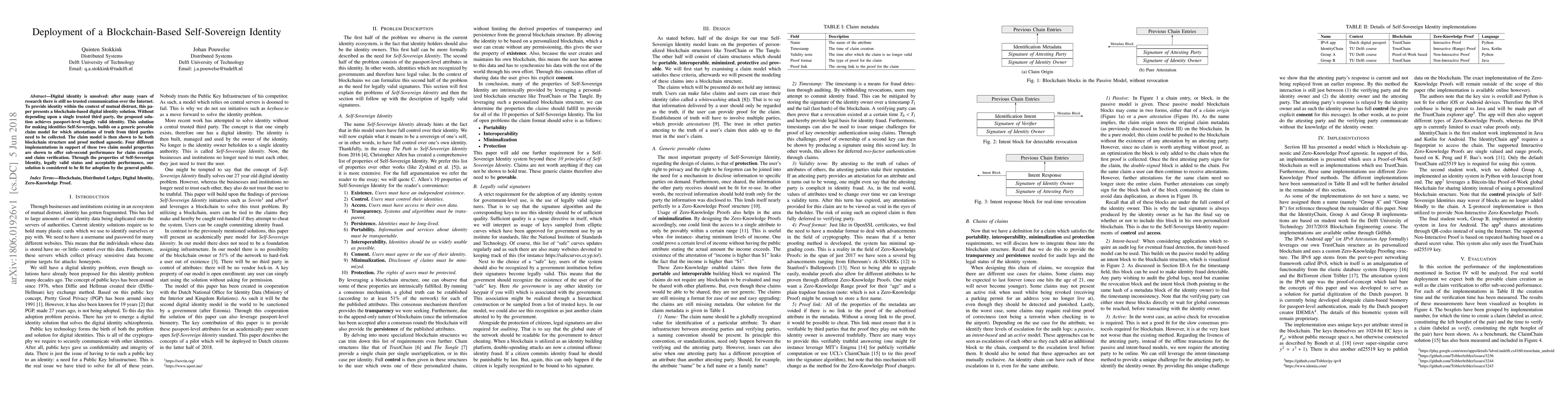 Digital identity is unsolved: after many years of research there is still no trusted communication over the Internet. To provide identity within the context of mutual distrust, this paper presents a blockchain-based digital identity solution. Without depending upon a single trusted third party, the proposed solution achieves passport-level legally valid identity. This solution for making identities Self-Sovereign, builds on a generic provable claim model for which attestations of truth from third parties need to be collected. The claim model is then shown to be both blockchain structure and proof method agnostic. Four different implementations in support of these two claim model properties are shown to offer sub-second performance for claim creation and claim verification. Through the properties of Self-Sovereign Identity, legally valid status and acceptable performance, our solution is considered to be fit for adoption by the general public.