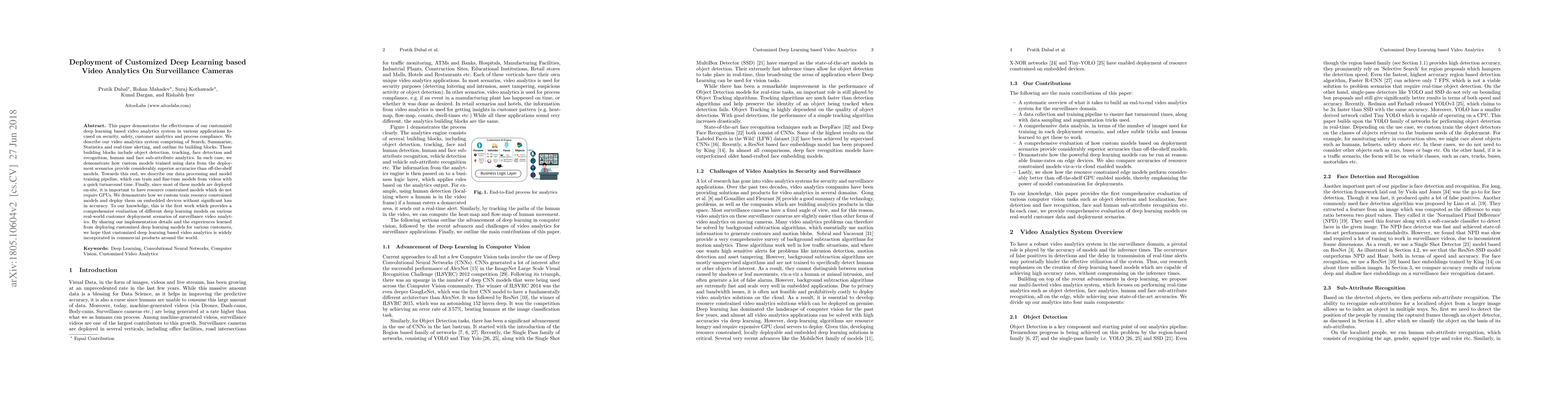 This paper presents a customized deep learning-based video analytics system for security and customer applications, showing superior accuracy of custom models over off-the-shelf alternatives. It details the deployment of resource-constrained models on embedded devices for real-world surveillance scenarios.