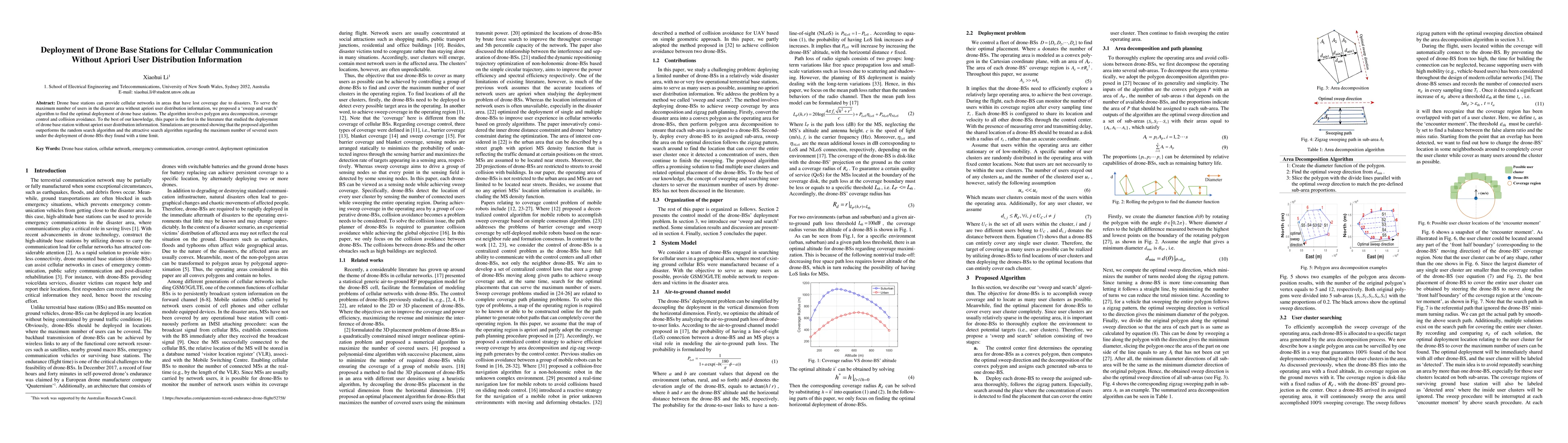 This paper proposes a 'sweep and search' algorithm for deploying drone base stations in disaster areas without prior user distribution knowledge, utilizing polygon area decomposition, coverage control, and collision avoidance. Simulation results show that the algorithm outperforms random and attractive search methods in maximizing user coverage within a time limit.