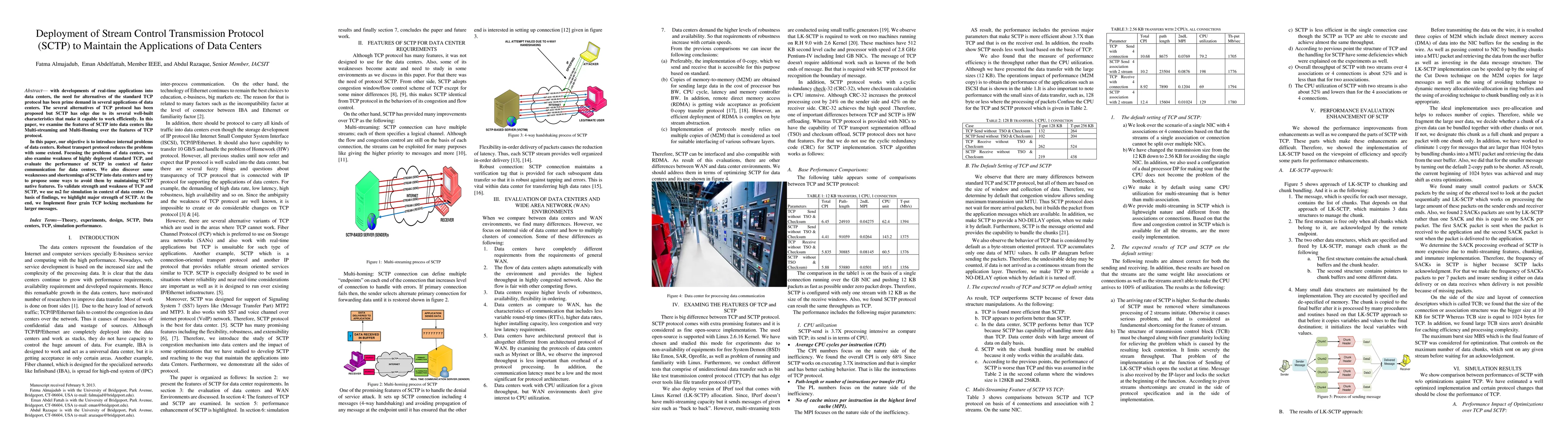 Summary: This paper explores the deployment of Stream Control Transmission Protocol (SCTP) in data centers to address real-time application needs, highlighting its advantages over TCP, such as multi-streaming and multi-homing. It evaluates SCTP's performance and identifies its weaknesses, proposing solutions to maintain its native features while mitigating these issues. Simulation results using ns2 underscore SCTP's strengths in data center communication.