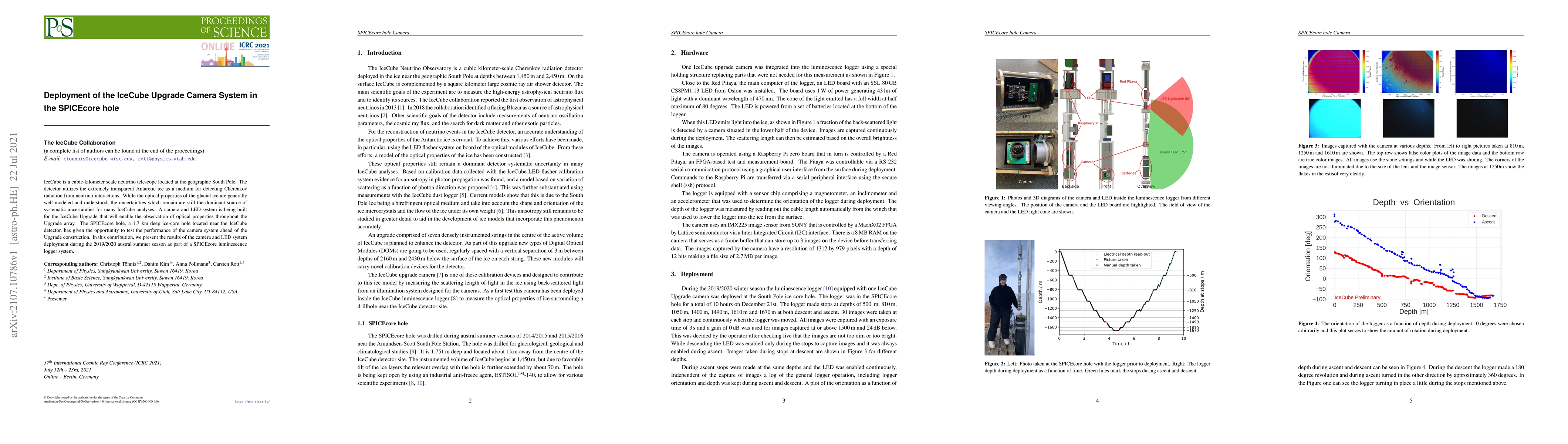 This paper details the deployment of the IceCube Upgrade Camera System in the SPICEcore hole, providing a testbed for observing optical properties of Antarctic ice. The results from the 2019/2020 austral summer season demonstrate the system's performance as part of a luminescence logger, aiding in reducing systematic uncertainties in IceCube analyses.