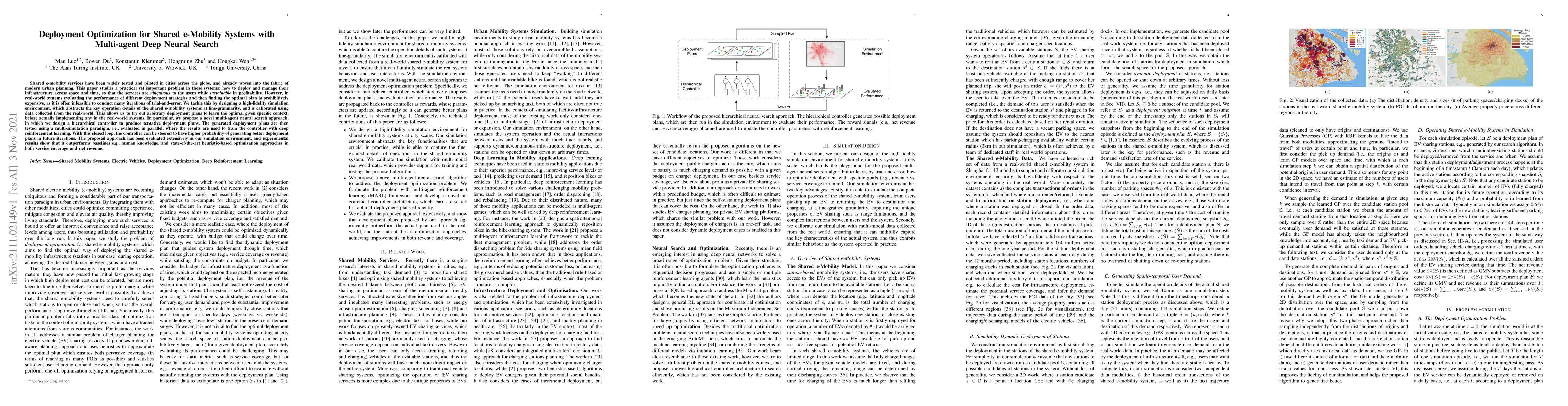 Shared e-mobility services have been widely tested and piloted in cities across the globe, and already woven into the fabric of modern urban planning. This paper studies a practical yet important problem in those systems: how to deploy and manage their infrastructure across space and time, so that the services are ubiquitous to the users while sustainable in profitability. However, in real-world systems evaluating the performance of different deployment strategies and then finding the optimal plan is prohibitively expensive, as it is often infeasible to conduct many iterations of trial-and-error. We tackle this by designing a high-fidelity simulation environment, which abstracts the key operation details of the shared e-mobility systems at fine-granularity, and is calibrated using data collected from the real-world. This allows us to try out arbitrary deployment plans to learn the optimal given specific context, before actually implementing any in the real-world systems. In particular, we propose a novel multi-agent neural search approach, in which we design a hierarchical controller to produce tentative deployment plans. The generated deployment plans are then tested using a multi-simulation paradigm, i.e., evaluated in parallel, where the results are used to train the controller with deep reinforcement learning. With this closed loop, the controller can be steered to have higher probability of generating better deployment plans in future iterations. The proposed approach has been evaluated extensively in our simulation environment, and experimental results show that it outperforms baselines e.g., human knowledge, and state-of-the-art heuristic-based optimization approaches in both service coverage and net revenue.