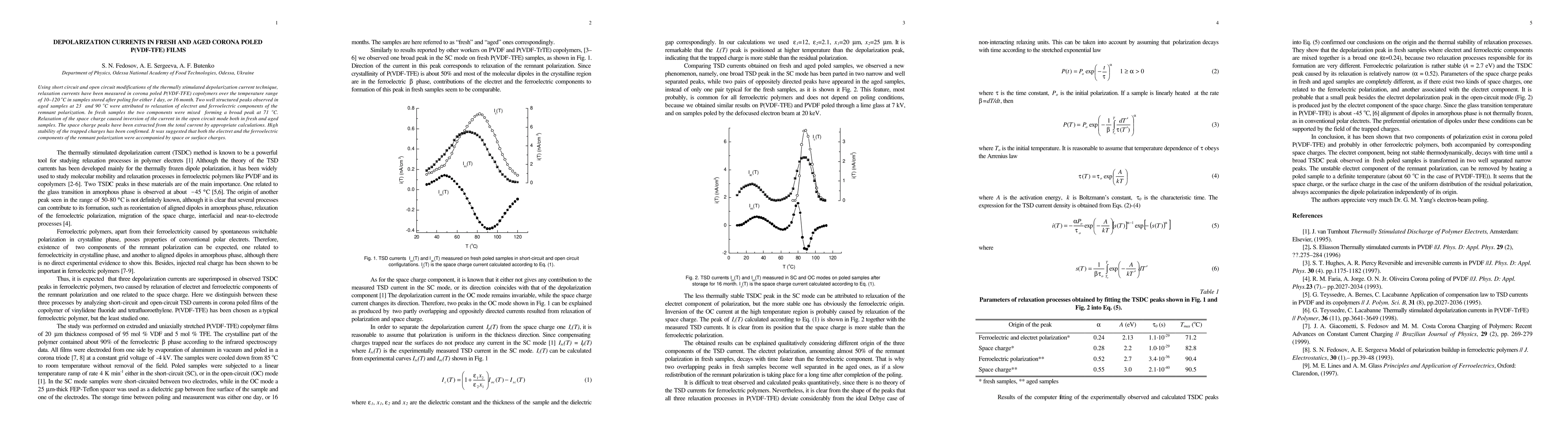 This study investigates the depolarization currents in fresh and aged corona poled P(VDF-TFE) films using modified thermally stimulated depolarization current techniques. Aged samples showed distinct peaks attributed to electret and ferroelectric relaxation, while fresh samples exhibited a broad peak due to mixed components. Trapped charges were found to be more stable than polarization, suggesting both components are associated with space or surface charges.