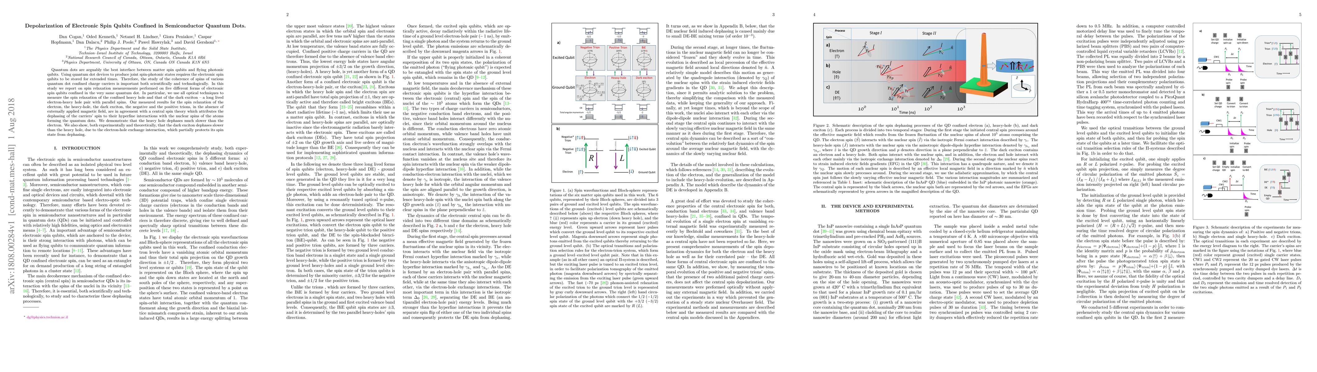 Researchers studied spin relaxation of electronic spin qubits in semiconductor quantum dots, finding that heavy holes dephase slower than electrons, while dark excitons dephase even slower due to electron-hole exchange interactions.