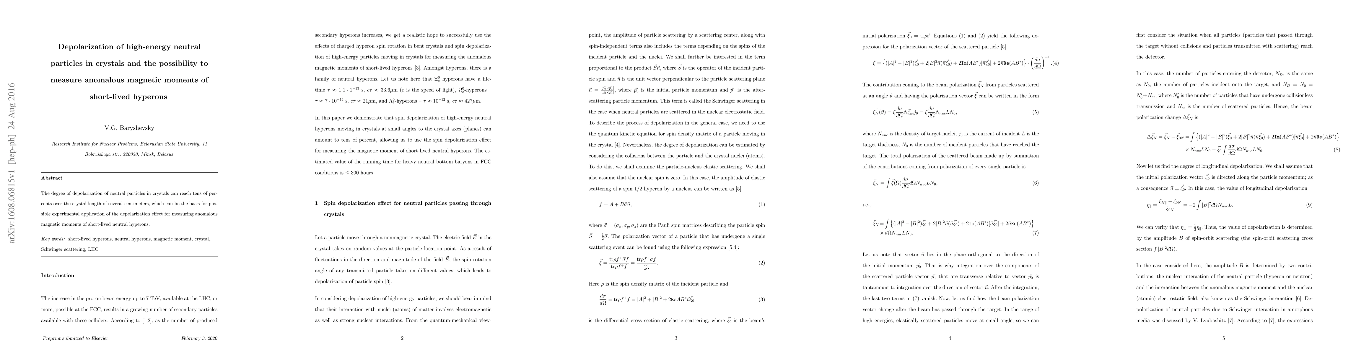This paper explores the significant depolarization of high-energy neutral particles in crystals, suggesting it could enable experimental measurement of anomalous magnetic moments of short-lived hyperons. The depolarization effect, observed over several centimeters in crystal length, presents a promising method for such measurements.