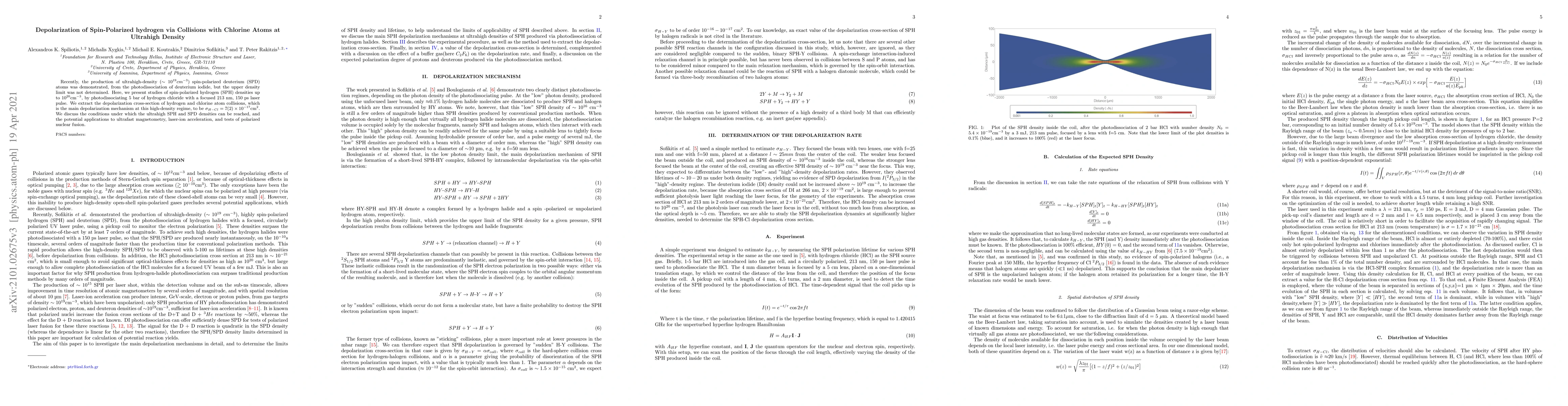 Recently, the production of ultrahigh-density (~10^{19}cm^{-3}) spin-polarized deuterium (SPD) atoms was demonstrated, from the photodissociation of deuterium iodide, but the upper density limit was not determined. Here, we present studies of spin-polarized hydrogen (SPH) densities up to 10^{20} cm^{-3}, by photodissociating 5 bar of hydrogen chloride with a focused 213 nm, 150 ps laser pulse. We extract the depolarization cross-section of hydrogen and chlorine atom collisions, which is the main depolarization mechanism at this high-density regime, to be {\sigma}_{HCl} = 7(2) x 10^{-17}cm^2. We discuss the conditions under which the ultrahigh SPH and SPD densities can be reached, and the potential applications to ultrafast magnetometry, laser-ion acceleration, and tests of polarized nuclear fusion.
