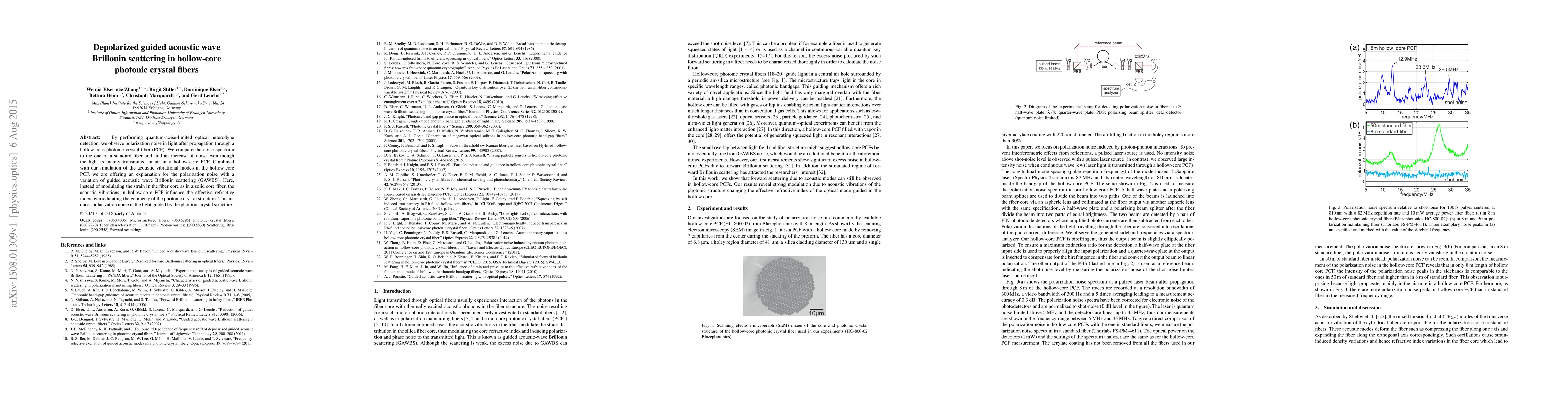 This study observes polarization noise in light through quantum-noise-limited optical detection after traveling in a hollow-core photonic crystal fiber, attributing the noise to depolarized guided acoustic wave Brillouin scattering (GAWBS) due to acoustic vibrations modulating the fiber’s photonic crystal geometry rather than the core. Simulations confirm the effect and explain the increased noise compared to standard fibers.