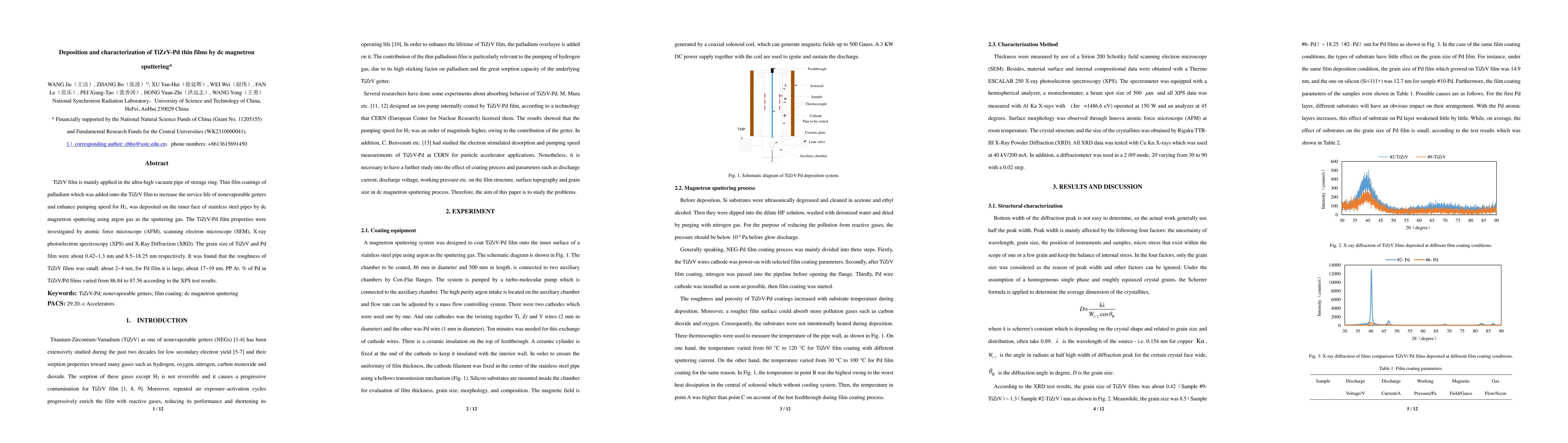 This study deposited TiZrV-Pd thin films on stainless steel pipes using dc magnetron sputtering to enhance the performance of nonevaporable getters. The films were characterized using AFM, SEM, XPS, and XRD, revealing grain sizes of 0.42~1.3 nm for TiZrV and 8.5~18.25 nm for Pd, with Pd content ranging from 86.84% to 87.56%.