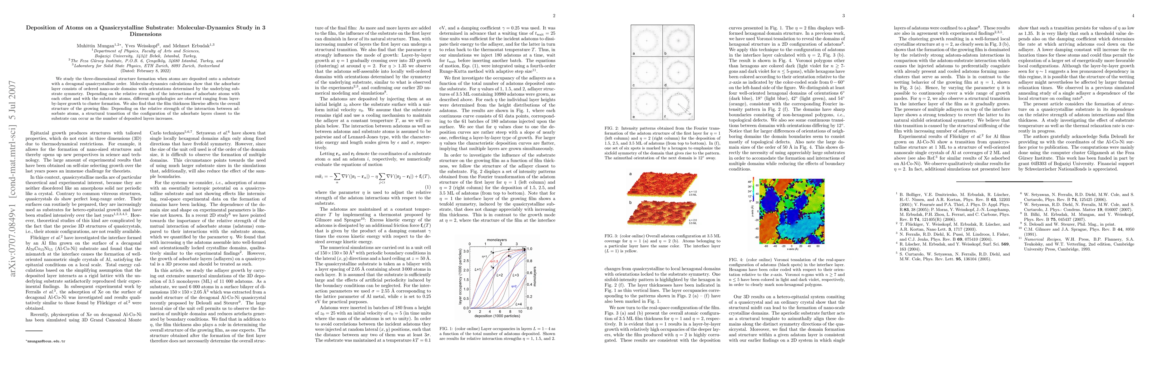 We study the three-dimensional structure formation when atoms are deposited onto a substrate with a decagonal quasicrystalline order. Molecular-dynamicscalculations show that the adsorbate layer consists of ordered nano-scale domains with orientations determined by the underlying substrate symmetry. Depending on the relative strength of the interactions of adsorbate atoms with each other and with the substrate atoms, different morphologies are observed ranging from layer-by-layer growth to cluster formation. We also find that the film thickness likewise affects the overall structure of the growing film: Depending on the relative strength of the interaction between adsorbate atoms, a structural transition of the configuration of the adsorbate layers closest to the substrate can occur as the number of deposited layers increases.