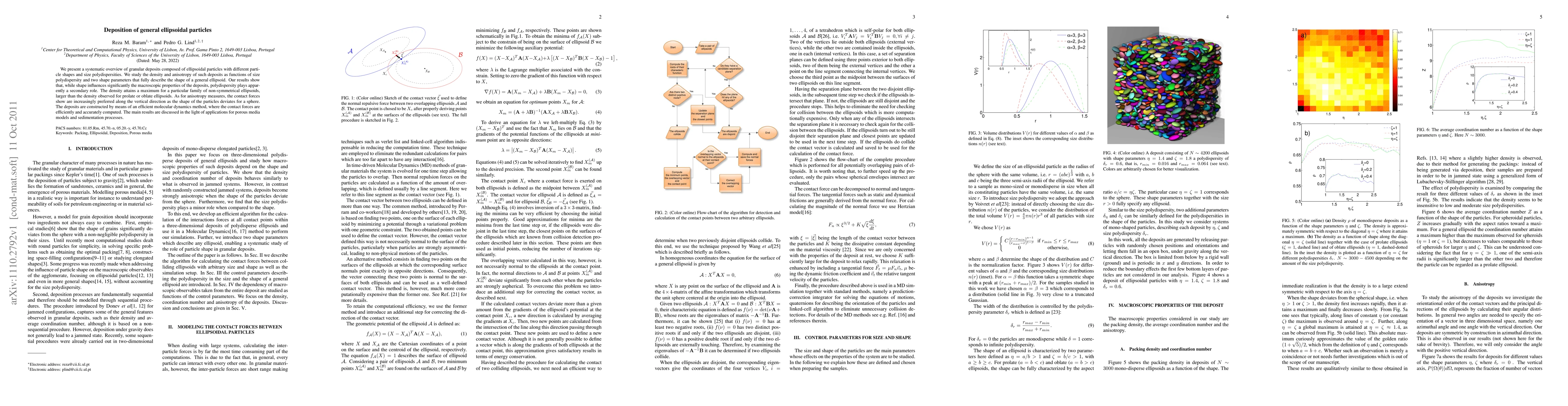 We present a systematic overview of granular deposits composed of ellipsoidal particles with different particle shapes and size polydispersities. We study the density and anisotropy of such deposits as functions of size polydispersity and two shape parameters that fully describe the shape of a general ellipsoid. Our results show that, while shape influences significantly the macroscopic properties of the deposits, polydispersity plays apparently a secondary role. The density attains a maximum for a particular family of non-symmetrical ellipsoids, larger than the density observed for prolate or oblate ellipsoids. As for anisotropy measures, the contact forces show are increasingly preferred along the vertical direction as the shape of the particles deviates for a sphere. The deposits are constructed by means of an efficient molecular dynamics method, where the contact forces are efficiently and accurately computed. The main results are discussed in the light of applications for porous media models and sedimentation processes.