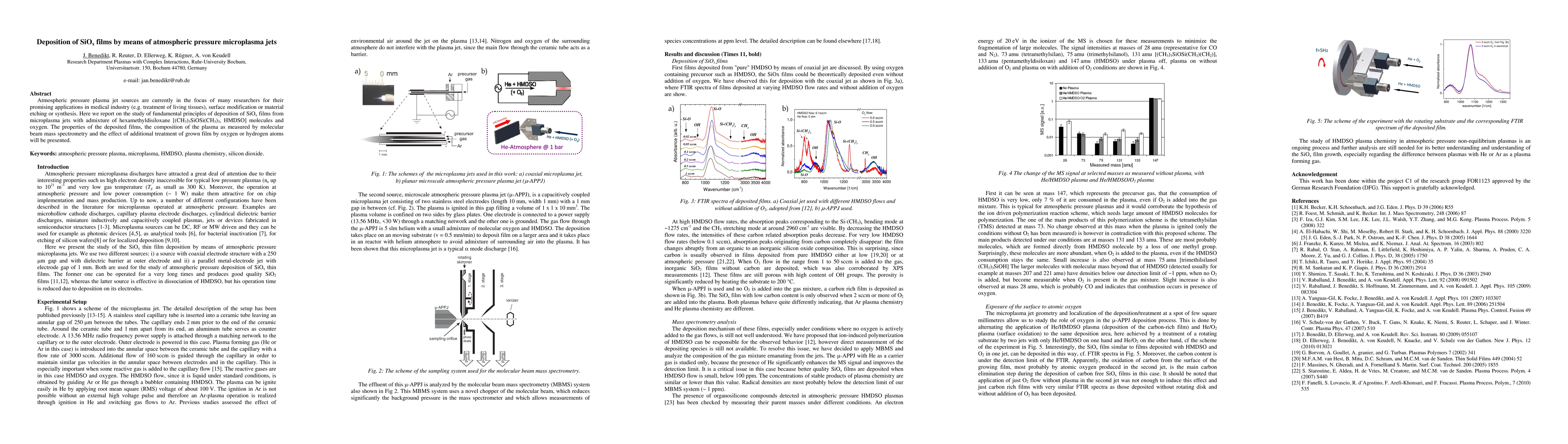 This paper investigates the deposition of SiOx films using atmospheric pressure microplasma jets with hexamethyldisiloxane and oxygen admixtures. It examines the film properties, plasma composition via molecular beam mass spectrometry, and the impact of post-deposition treatments with oxygen or hydrogen atoms.