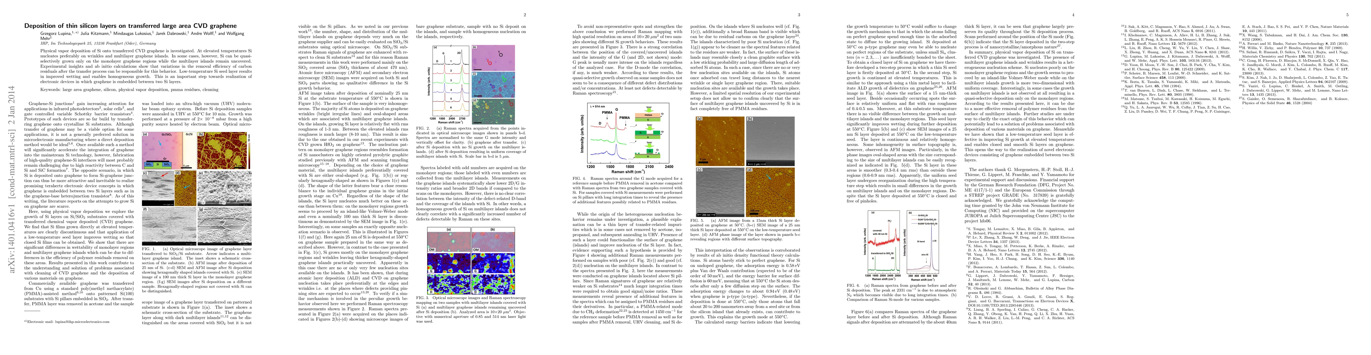 Physical vapor deposition of Si onto transferred graphene is investigated. At elevated temperatures, Si nucleates preferably on wrinkles and multilayer graphene islands. In some cases, however, Si can be quasi-selectively grown only on the monolayer graphene regions while the multilayer islands remain uncovered. Experimental insights and ab initio calculations show that variations in the removal efficiency of carbon residuals after the transfer process can be responsible for this behavior. Low-temperature Si seed layer results in improved wetting and enables homogeneous growth. This is an important step towards realization of electronic devices in which graphene is embedded between two Si layers.