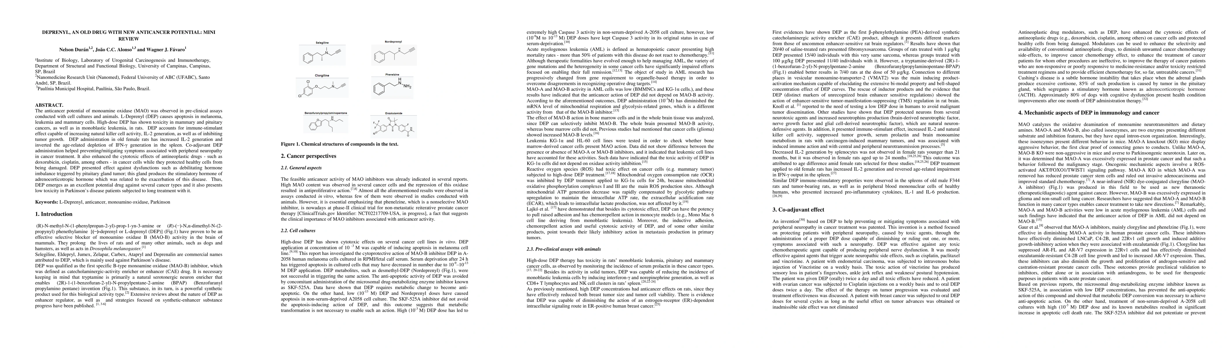 The anticancer potential of monoamine oxidase (MAO) was observed in pre-clinical assays conducted with cell cultures and animals. L-Deprenyl (DEP) causes apoptosis in melanoma, leukemia and mammary cells. High-dose DEP has shown toxicity in mammary and pituitary cancers, as well as in monoblastic leukemia, in rats. DEP accounts for immune-stimulant effect capable of increasing natural killer cell activity, IL-2 generation, as well as of inhibiting tumor growth. DEP administration in old female rats has increased IL-2 generation and inverted the age-related depletion of IFN-{\gamma} generation in the spleen. Co-adjuvant DEP administration helped preventing/mitigating symptoms associated with peripheral neuropathy in cancer treatment. It also enhanced the cytotoxic effects of antineoplastic drugs - such as doxorubicin, cisplatin, among others - in cancer cells while they protected healthy cells from being damaged. DEP presented effect against dysfunctions such as debilitating hormone imbalance triggered by pituitary gland tumor; this gland produces the stimulatory hormone of adrenocorticotropic hormone which was related to the exacerbation of this disease. Thus, DEP emerges as an excellent potential drug against several cancer types and it also presents low toxicity in Parkinson`s disease patients subjected to long treatment with it.