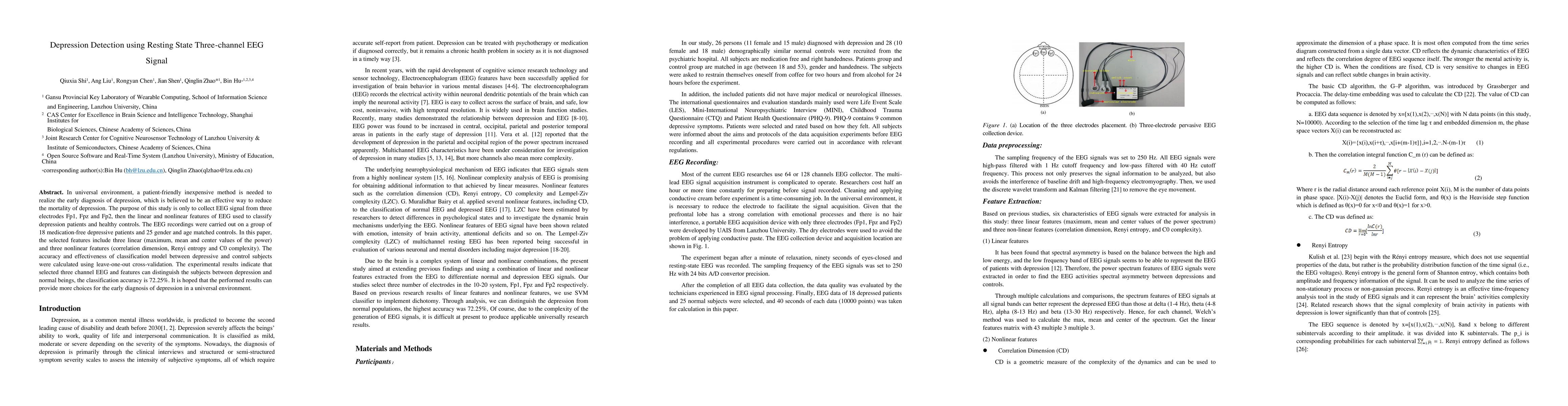 This study aims to develop a cost-effective method for early depression diagnosis using resting state three-channel EEG signals from Fp1, Fpz, and Fp2 electrodes. The classification model, utilizing linear and nonlinear features, achieved a 72.25% accuracy in distinguishing depressive patients from healthy controls.