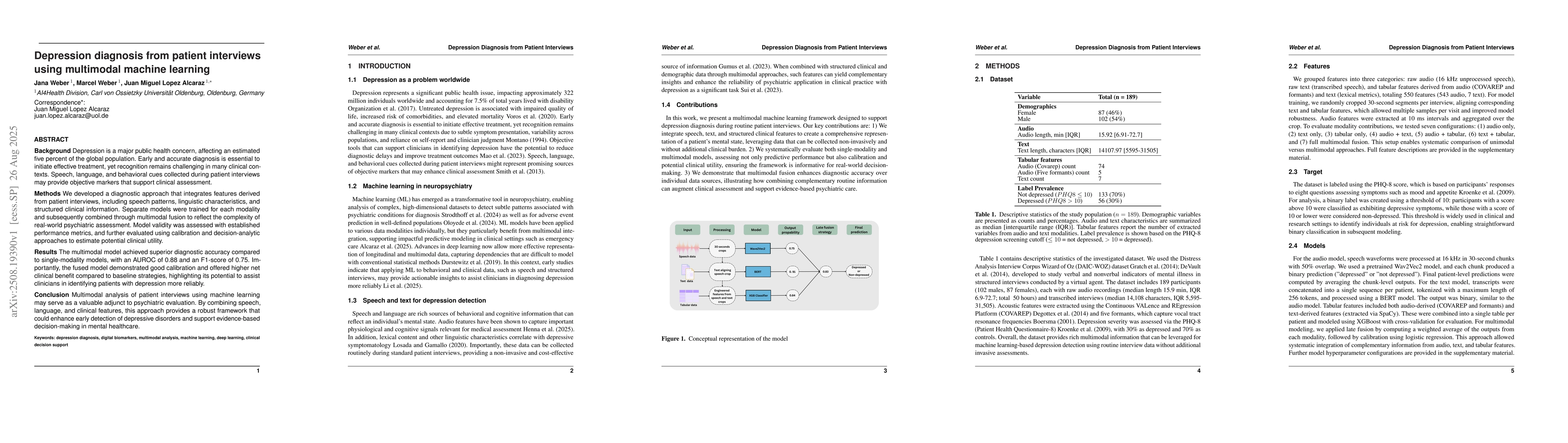 Background: Depression is a major public health concern, affecting an estimated five percent of the global population. Early and accurate diagnosis is essential to initiate effective treatment, yet recognition remains challenging in many clinical contexts. Speech, language, and behavioral cues collected during patient interviews may provide objective markers that support clinical assessment. Methods: We developed a diagnostic approach that integrates features derived from patient interviews, including speech patterns, linguistic characteristics, and structured clinical information. Separate models were trained for each modality and subsequently combined through multimodal fusion to reflect the complexity of real-world psychiatric assessment. Model validity was assessed with established performance metrics, and further evaluated using calibration and decision-analytic approaches to estimate potential clinical utility. Results: The multimodal model achieved superior diagnostic accuracy compared to single-modality models, with an AUROC of 0.88 and an F1-score of 0.75. Importantly, the fused model demonstrated good calibration and offered higher net clinical benefit compared to baseline strategies, highlighting its potential to assist clinicians in identifying patients with depression more reliably. Conclusion: Multimodal analysis of patient interviews using machine learning may serve as a valuable adjunct to psychiatric evaluation. By combining speech, language, and clinical features, this approach provides a robust framework that could enhance early detection of depressive disorders and support evidence-based decision-making in mental healthcare.