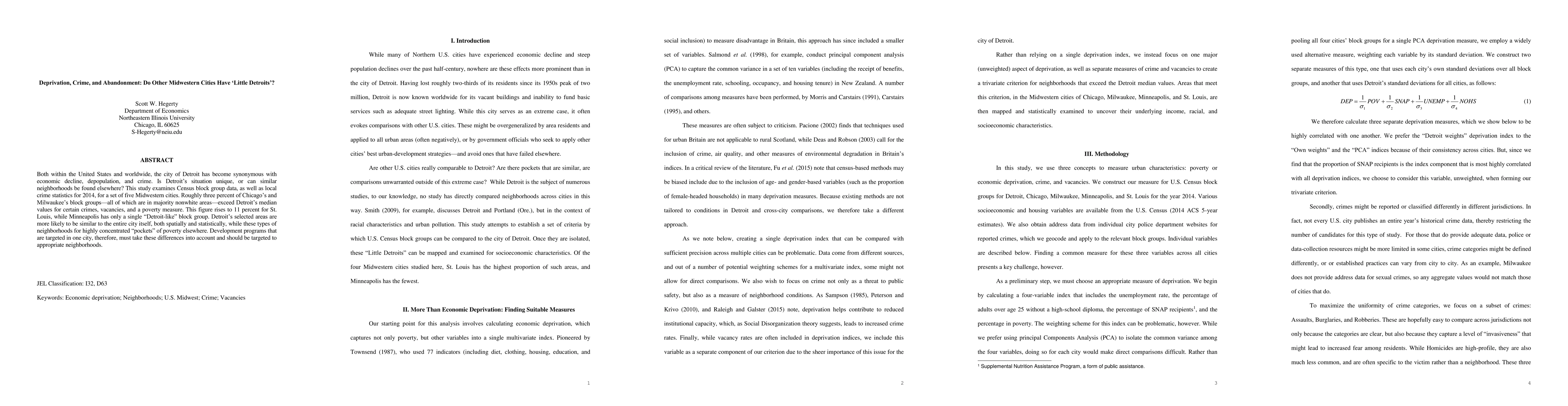 This study investigates whether other Midwestern cities exhibit neighborhoods similar to Detroit's economically declining, high-crime areas. It finds that while some neighborhoods in Chicago, Milwaukee, and St. Louis mirror Detroit's conditions, Minneapolis has only one such area, suggesting different patterns of urban decline across cities.