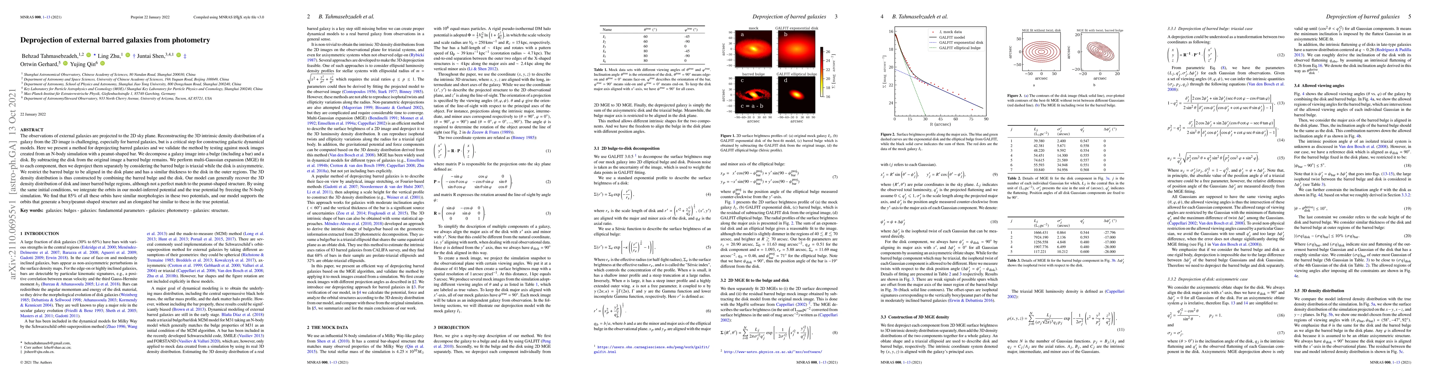 This paper introduces a method for deprojecting the 3D density distribution of barred galaxies from their 2D images, achieving a good match for the disk and inner barred bulge regions. The method successfully supports the generation of boxy/peanut-shaped structures and elongated bars.